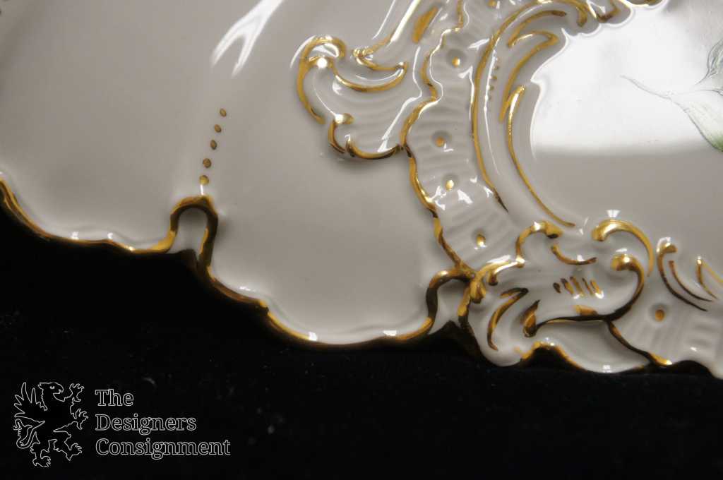 This gorgeous cabinet plate was produced between 1934-1944. White with a scalloped shape and Italian/French design. The plate is hand-painted with pink roses centered between gilt trim. The design is in low relief making this plate stand out in any setting.