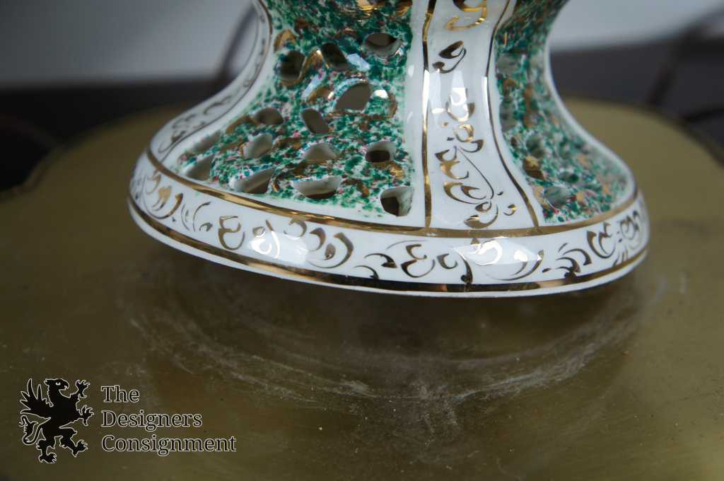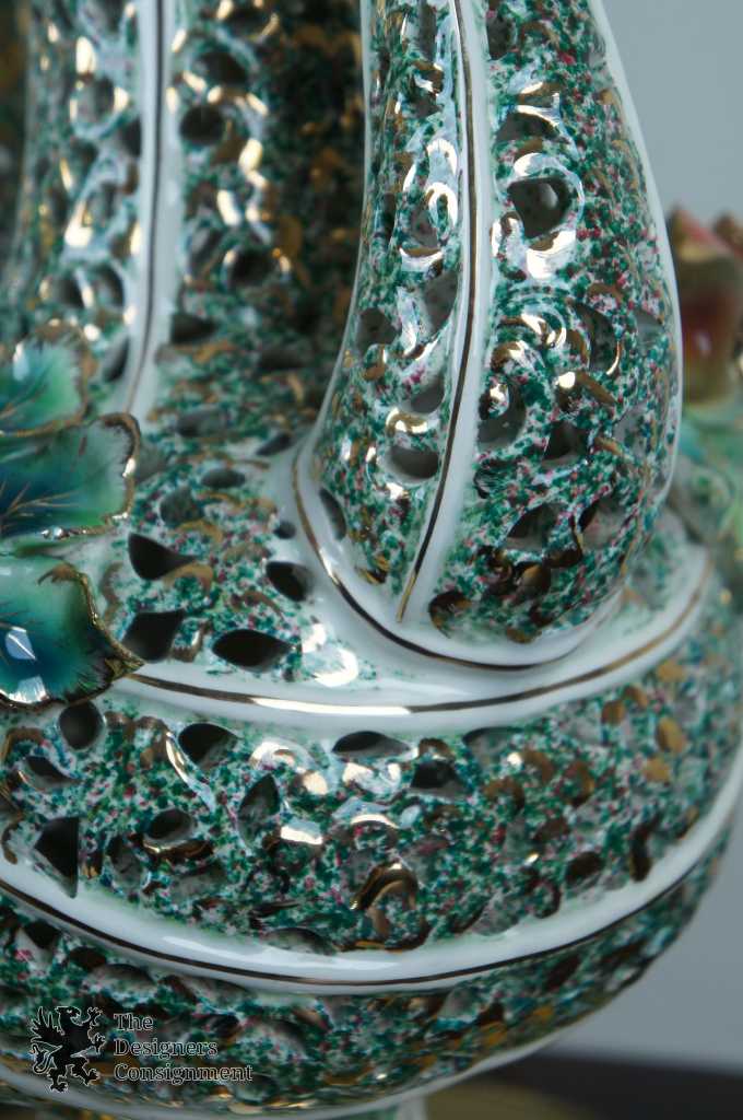 Features ornate reticulated porcelain body with hand painted accents and floral designs.