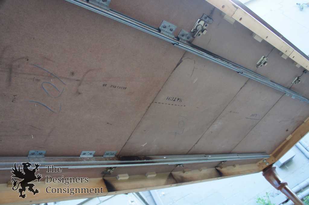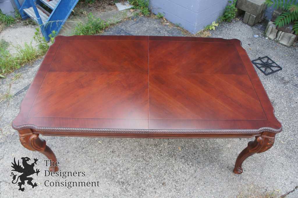 Thomasville River Roads Collection Dining Table. French Country style with mahogany finish. Rectangular with rounded corners and gadrooned trim. Legs are cabriole shaped with scallop shell carved accents. This table features 2 leafs with extension up to 112". Includes Table pads for protection.