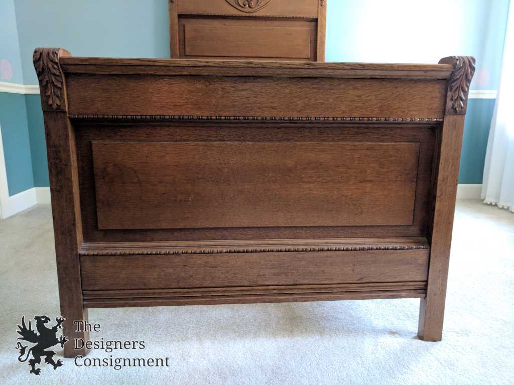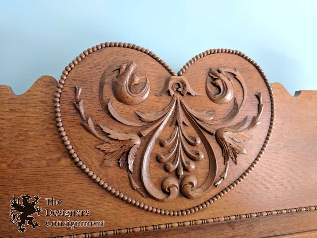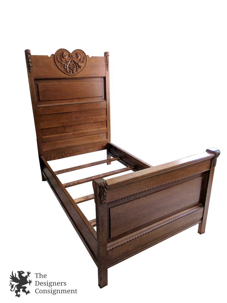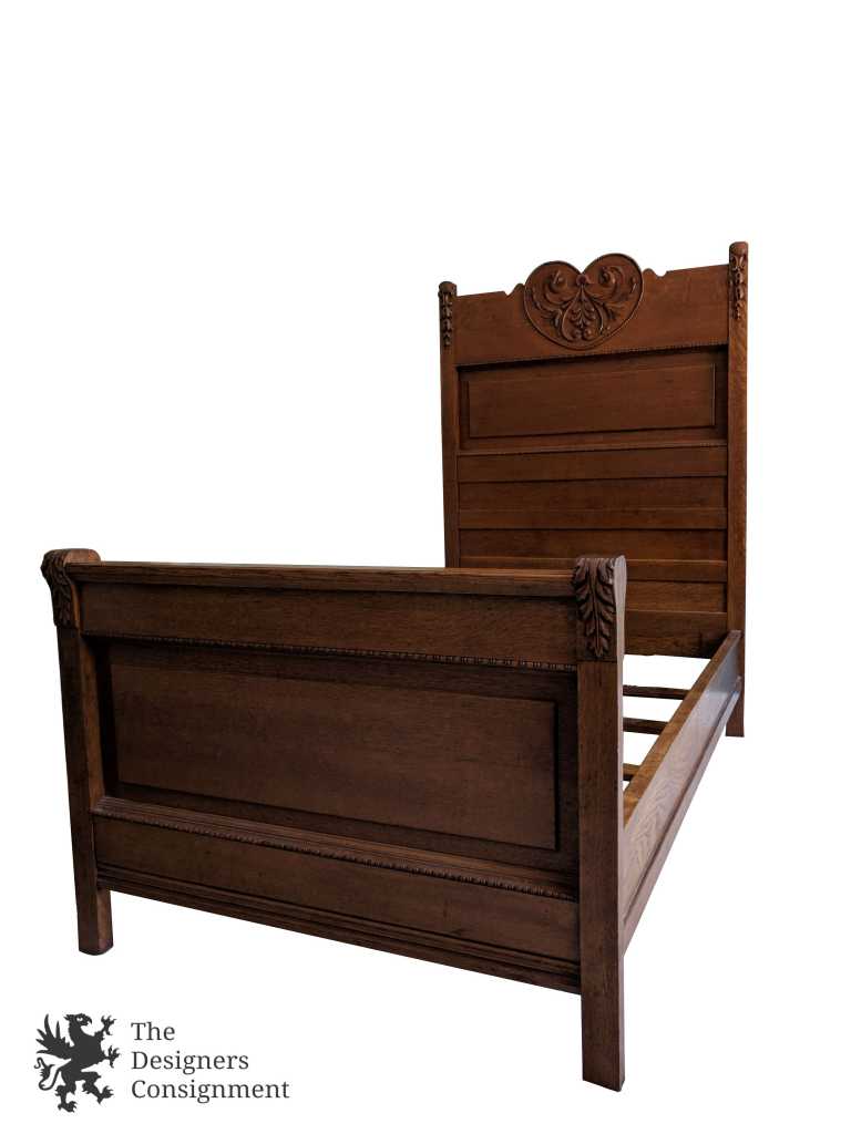 A beautiful turn of the century Arts & Crafts style panel bed. Made from oak with intricately carved accents. Features a high serpentine back centered with flourishes between a heart shaped design. Each post is carved along the front with an acanthus design. Panels are framed with additional carving to add additional depth. A beautiful overall design that will look great in any setting. The rear panel of the bed can be knocked out to add a mirror.