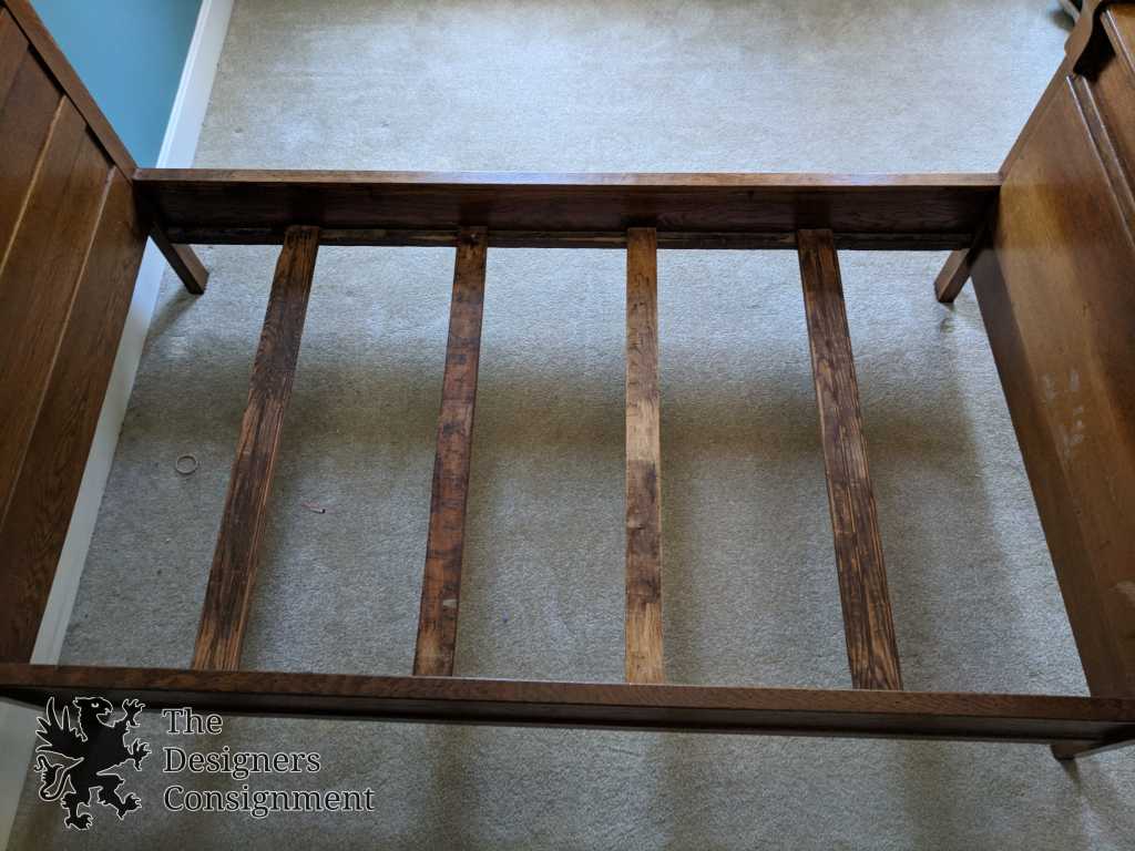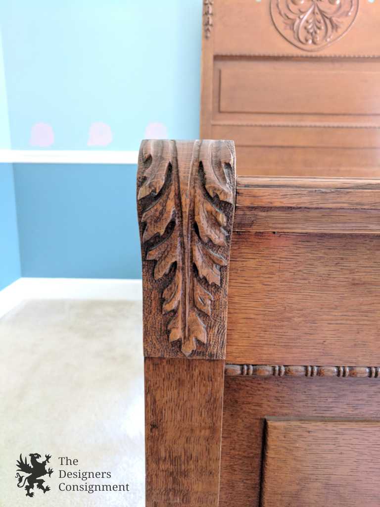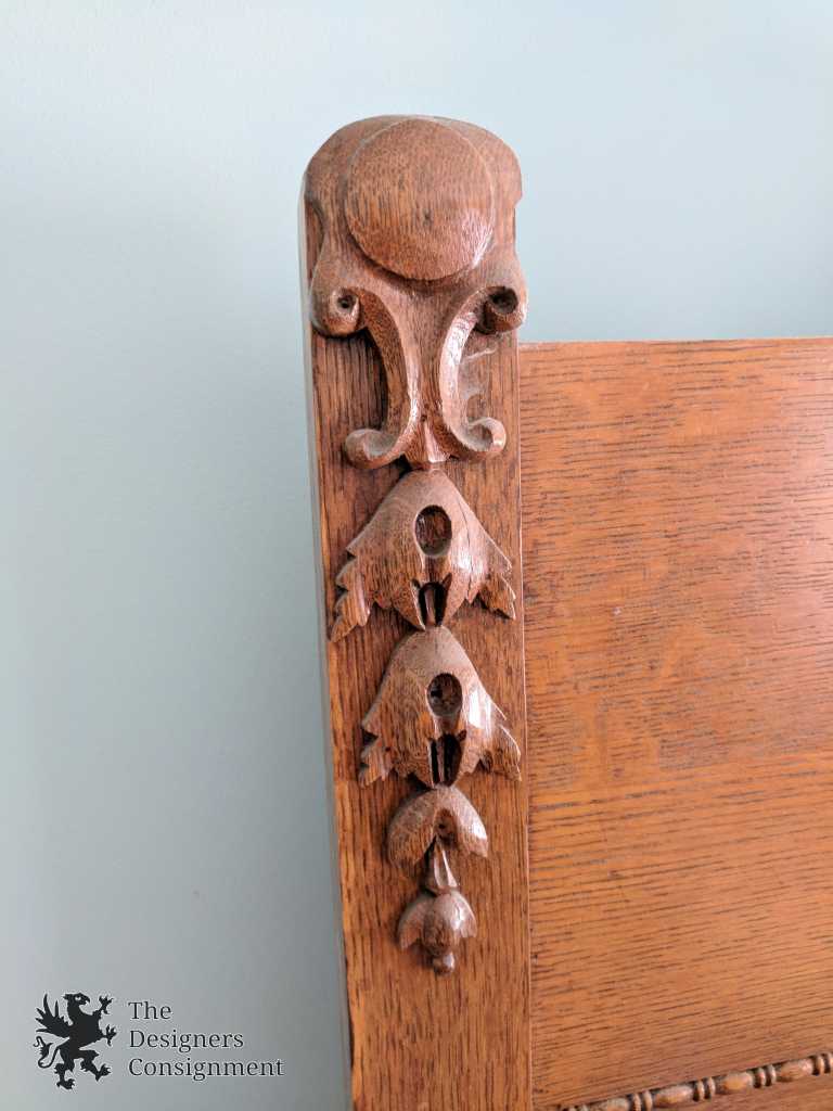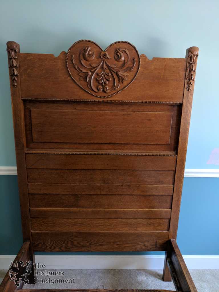 A beautiful turn of the century Arts & Crafts style panel bed. Made from oak with intricately carved accents. Features a high serpentine back centered with flourishes between a heart shaped design. Each post is carved along the front with an acanthus design. Panels are framed with additional carving to add additional depth. A beautiful overall design that will look great in any setting. The rear panel of the bed can be knocked out to add a mirror.