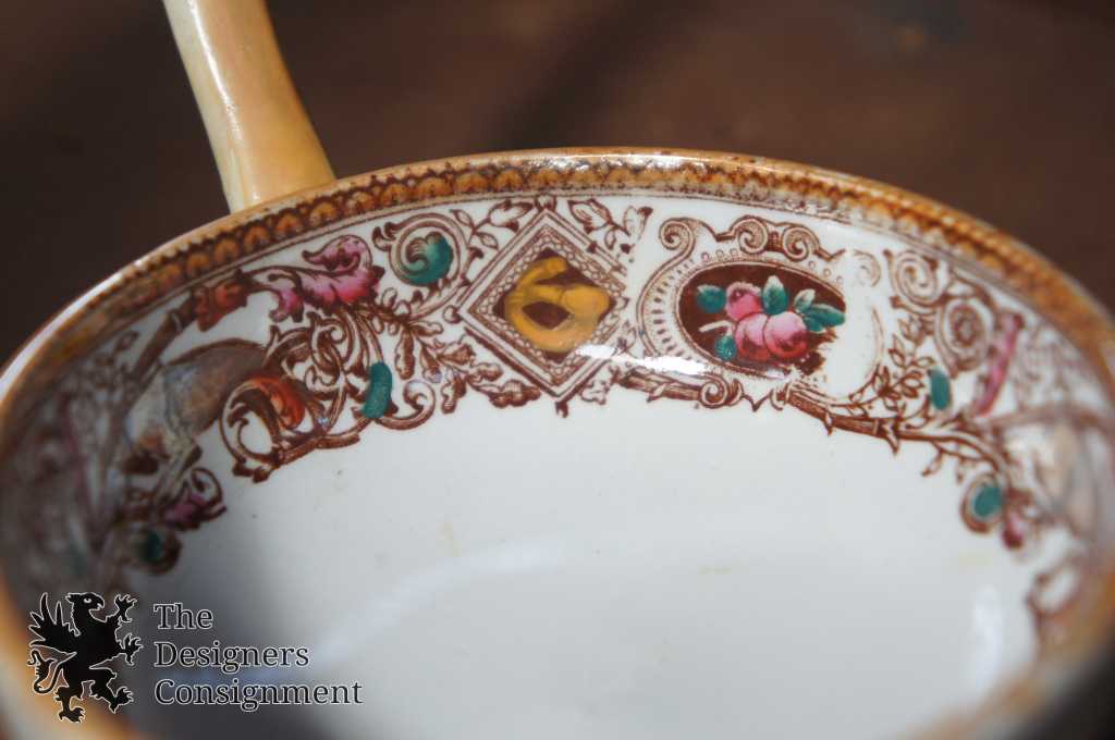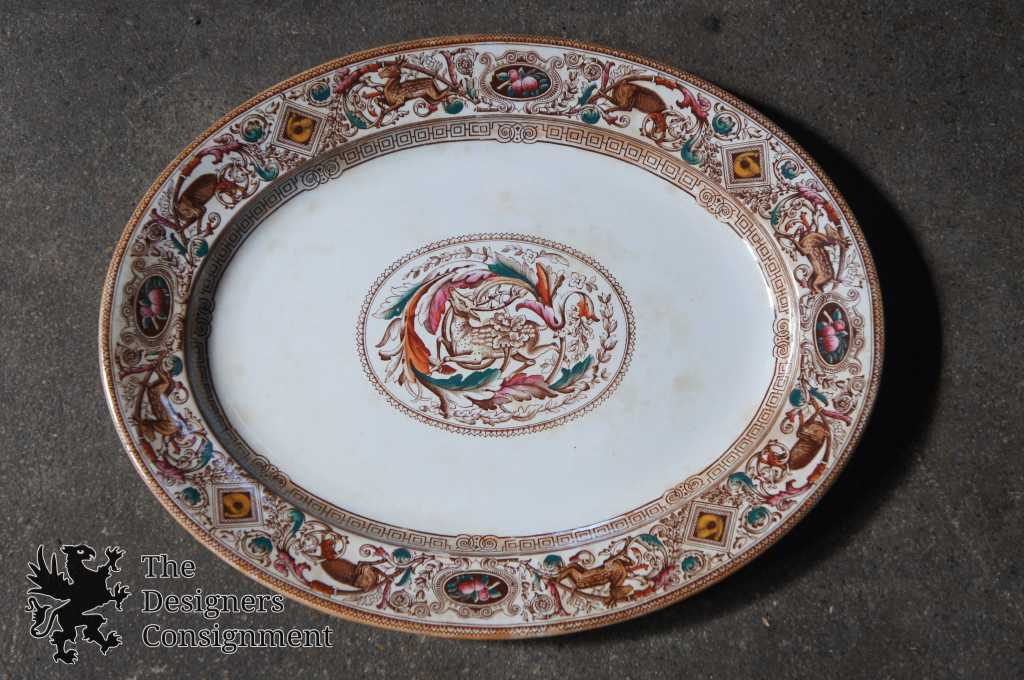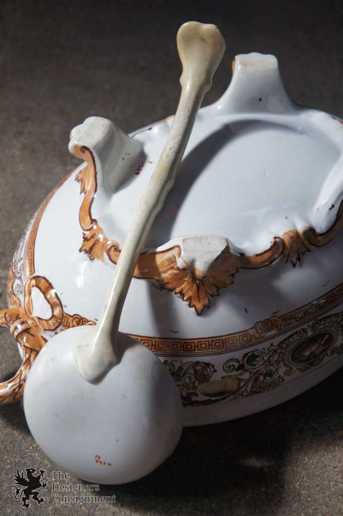 Here we have a magnificent tureen complete with ladle and tray. Beautifully designed Aesthetic era (1880s) transferware. Complete with hunt scene showing food, flourishes and animals. The set has a white base with shades of brown, bronze and hints of colors along the design. Tureen is footed with lid and ribboned handle. The perfect piece for any setting.
