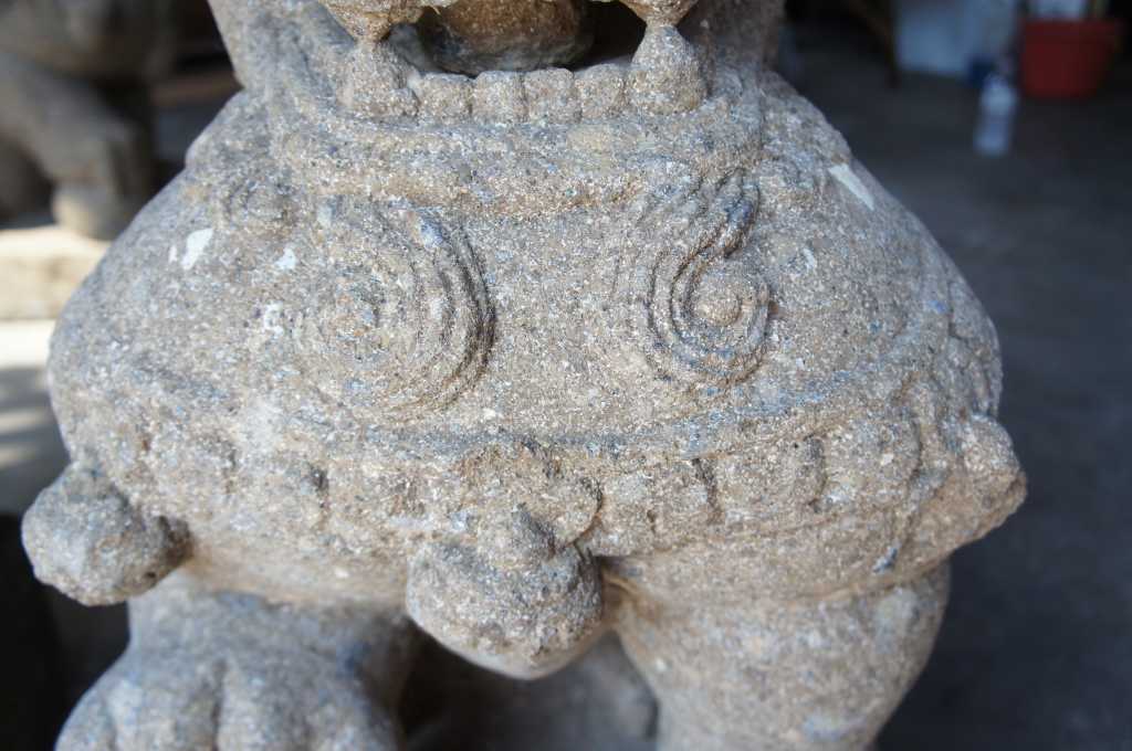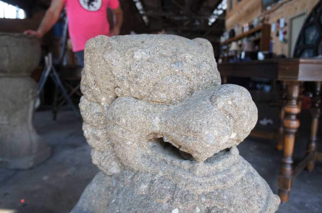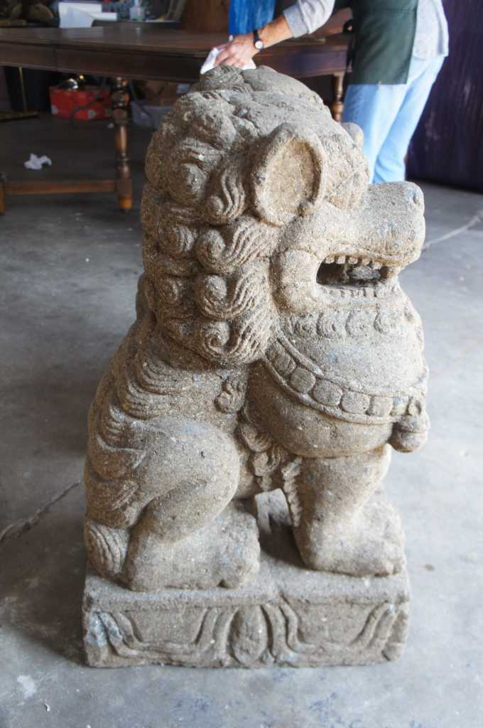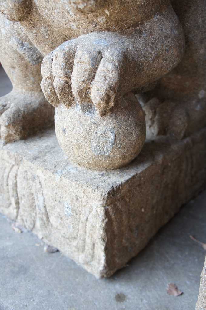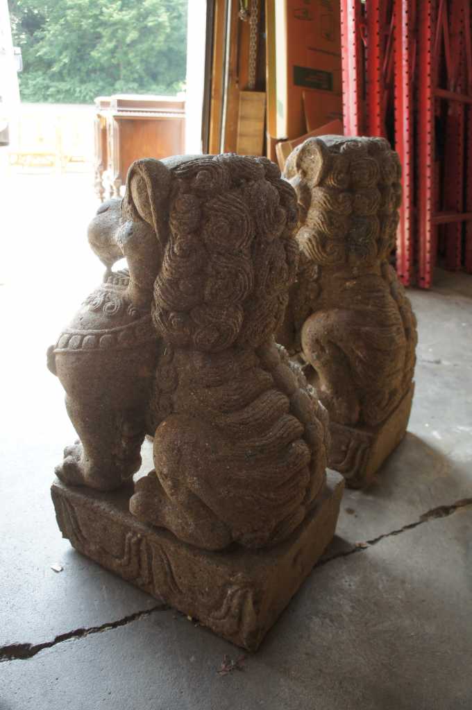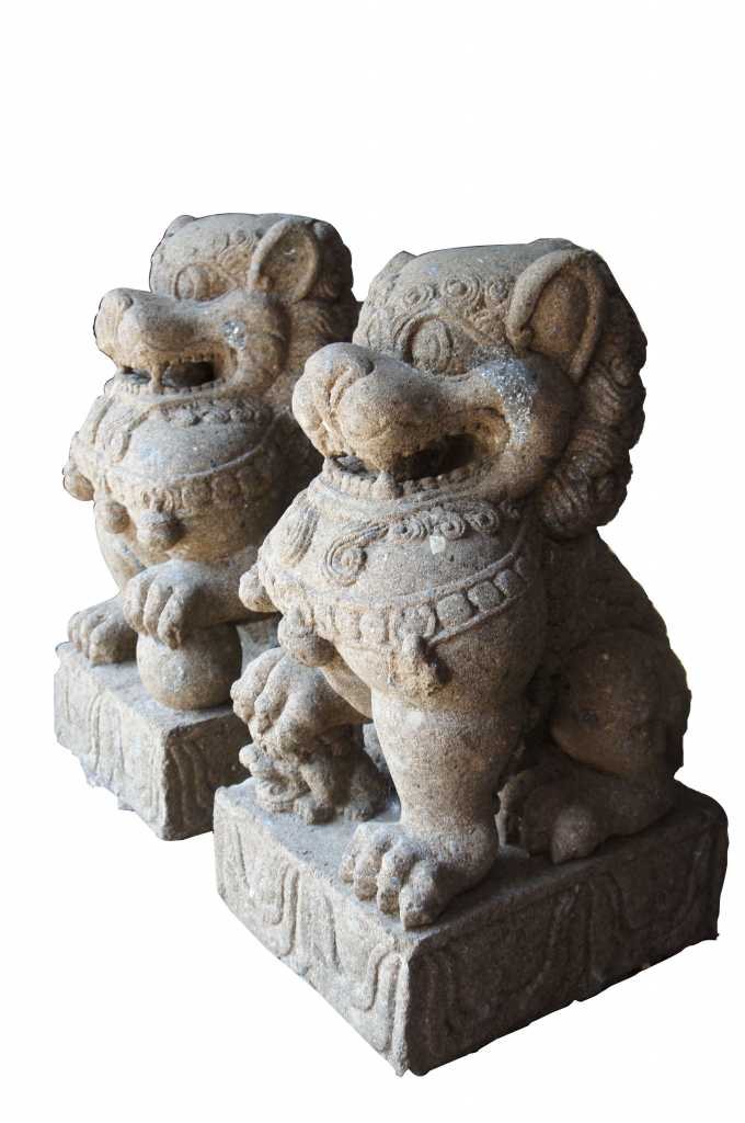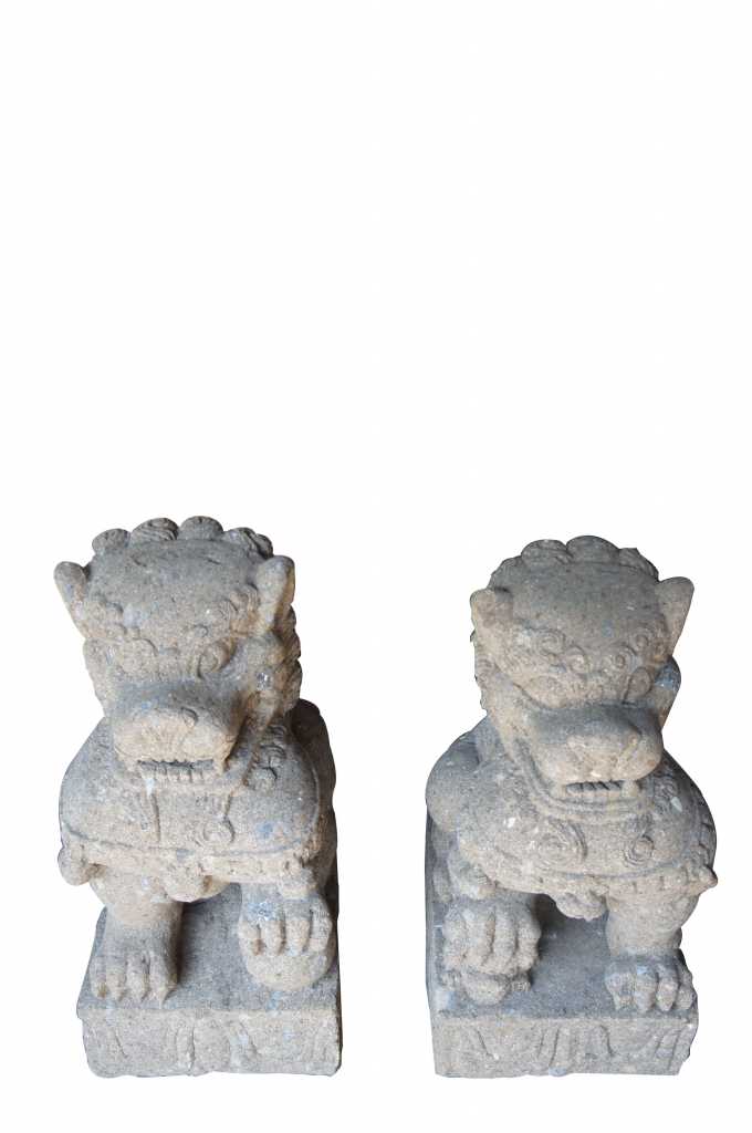 The perfect compliment to any doorway or garden setting. These stone Foo Dogs will bring you joy everyday. Meticulously detailed with a bit of a smile showing positive vibe. Foo dogs, or Lions are known as guardians and most often seen outdoors in front of palaces, temples and home of the elite. The female represents yin, and symbolically protects the people dwelling inside the home, while the male statue, representing yang, protects the structure itself. The male is recognized as the one resting his paw on the ball, which represents the world, and the female is shown with one paw on a cub. A great example of Feng Shui.