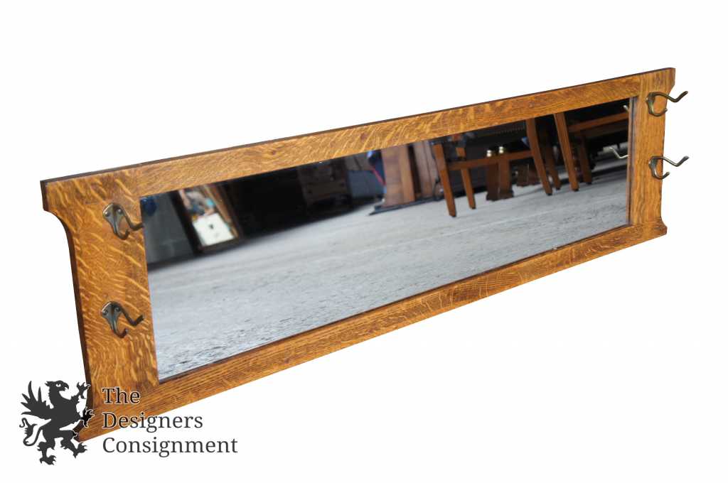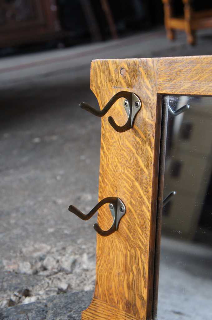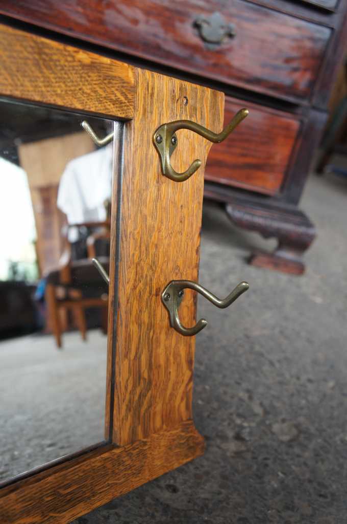 Vintage Oak Framed Hall Wall Mirror with Four Coat Hat Hooks Rectangular
