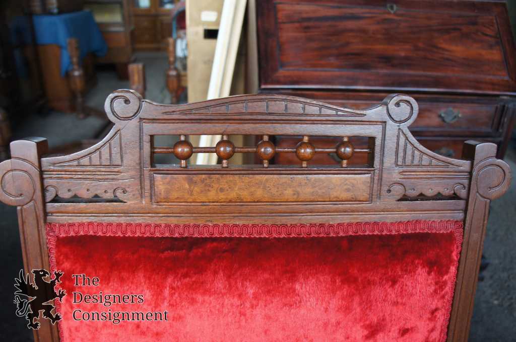 A beautiful late 19th century Victorian parlor set. Made from walnut in eastlake style with carved and burled accents. Features a settee, gossip bench, gentleman's and side chair. Finished in a red upholstery. A neat addition to any setting.