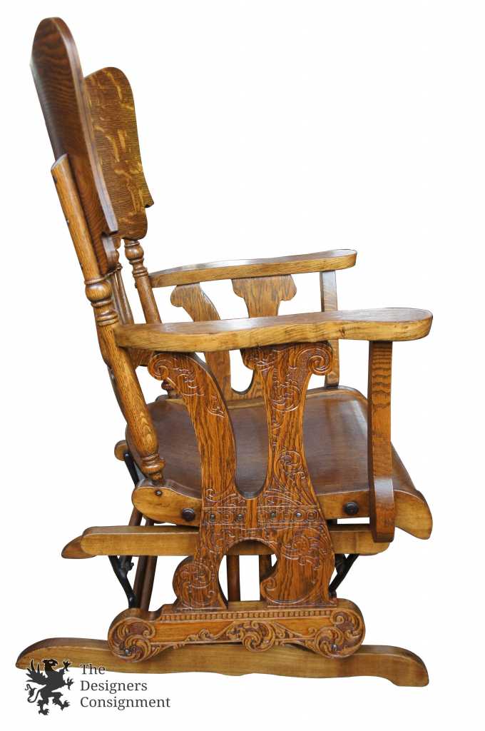 Late 19th century Victorian platform rocker. Mission style with a shield back leading down towards spindles and a bentwood seat. Features a carved front with french inspiration showing acorns, leaves and bell horn design over a ribboned accent. Sides show a pressed oak floral pattern. The platform design incorporates a cast iron swing support that was patented in May 29th, 1888. A beautiful work of art that will be a great addition to any setting.