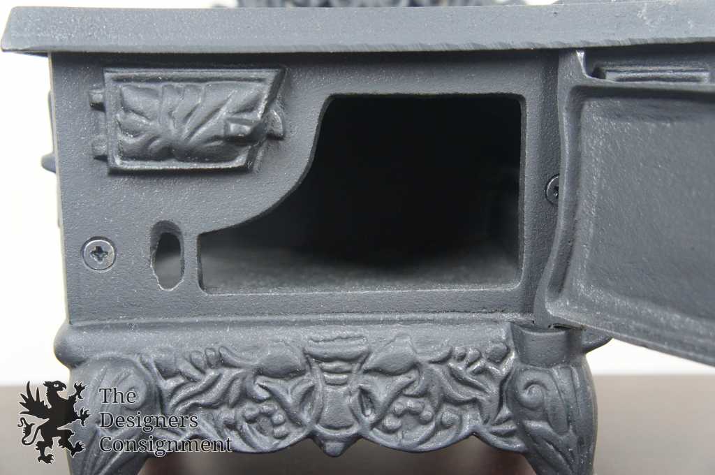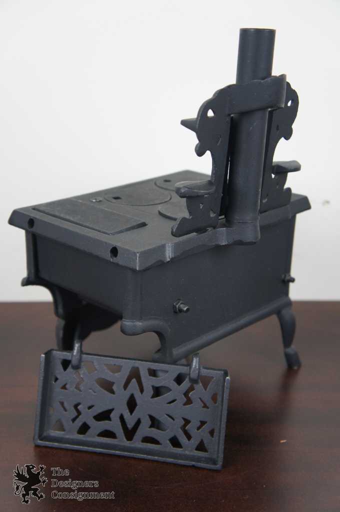 Impressive to think that before the era of the EZ Bake ovens that children were playing with wood burning miniature stoves! This cute example is a pre-1950s cast iron wood burning stove with accessories. Perfect for any collector