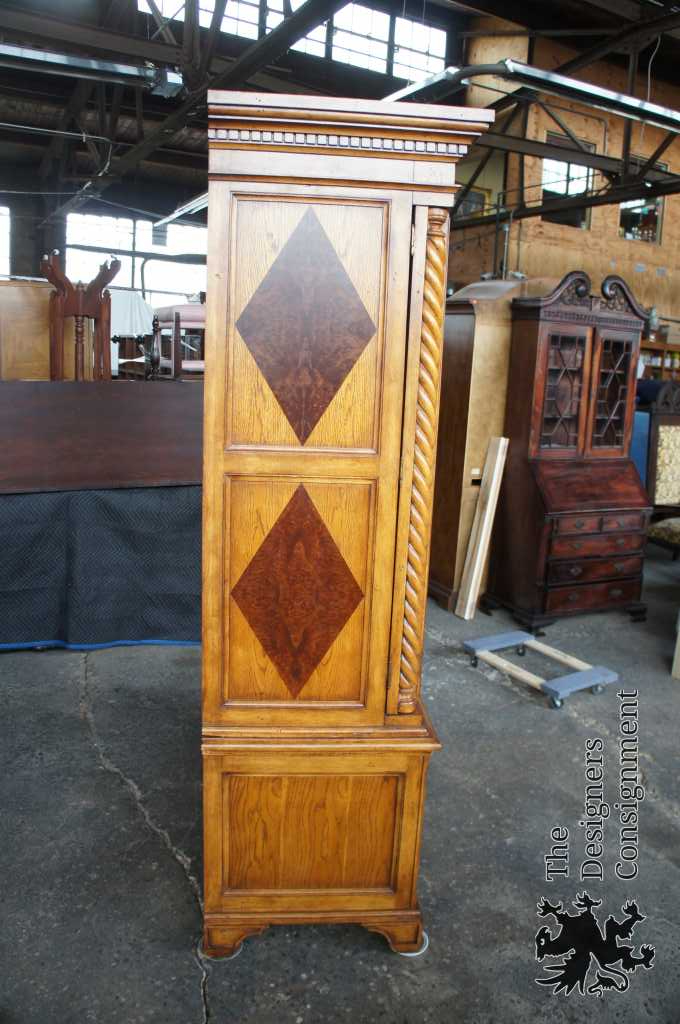 Neoclassical armoire by Alexander Julian. Part of the At Home collection. Features an elegant marquis pattern in walnut over oak. The corners are carved into a barley twist design. Doors are on a double hinge allowing them to fit flush along the sides when in use. Shipped via White Glove Service with hand delivery