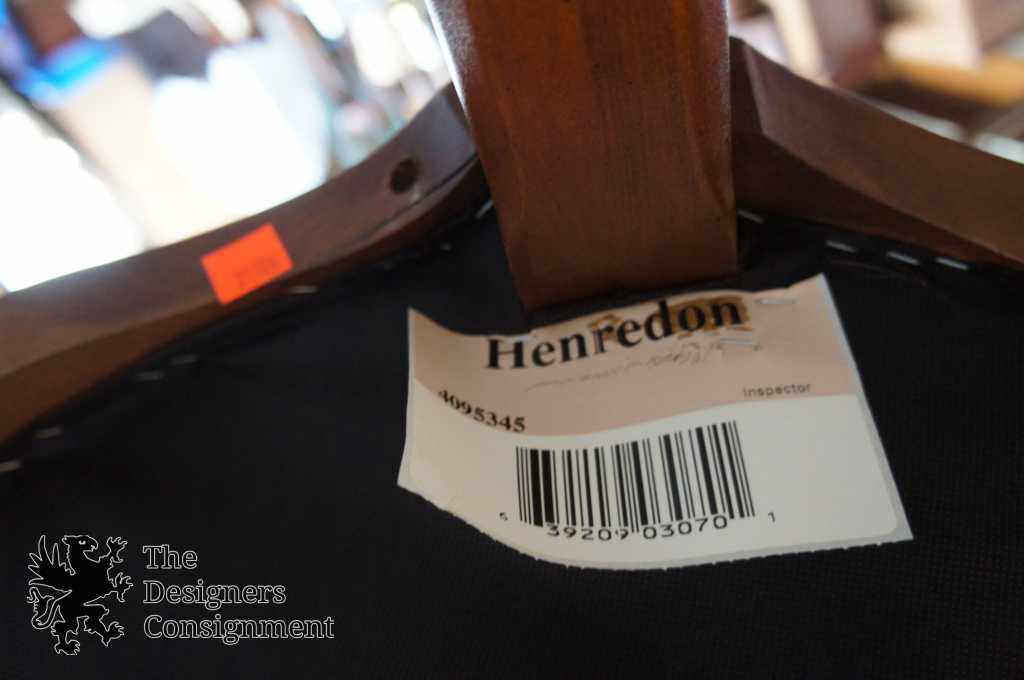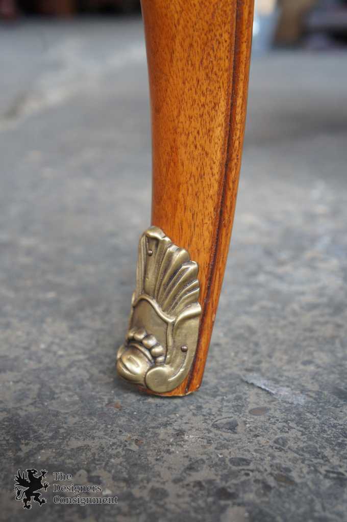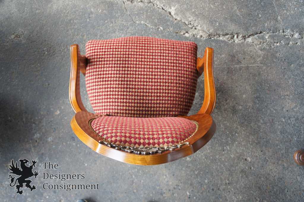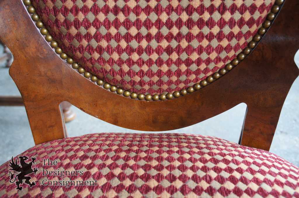 Henredon Olive wood burled chairs. Louis XVI style with brass mounted scalloped back and feet. Upholstered in a red checkered pattern with nailhead trim.