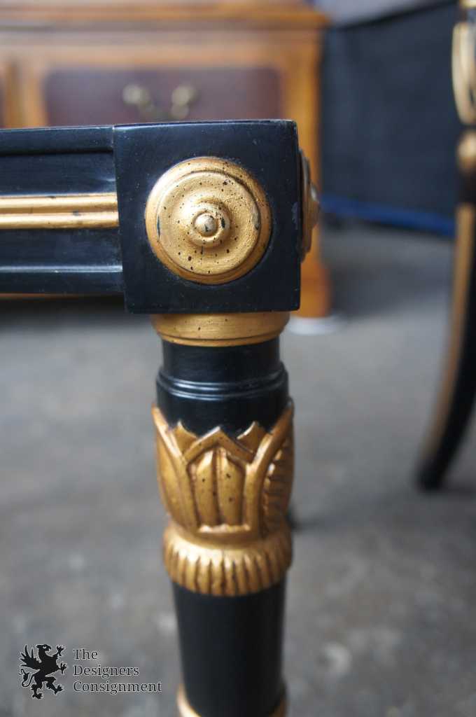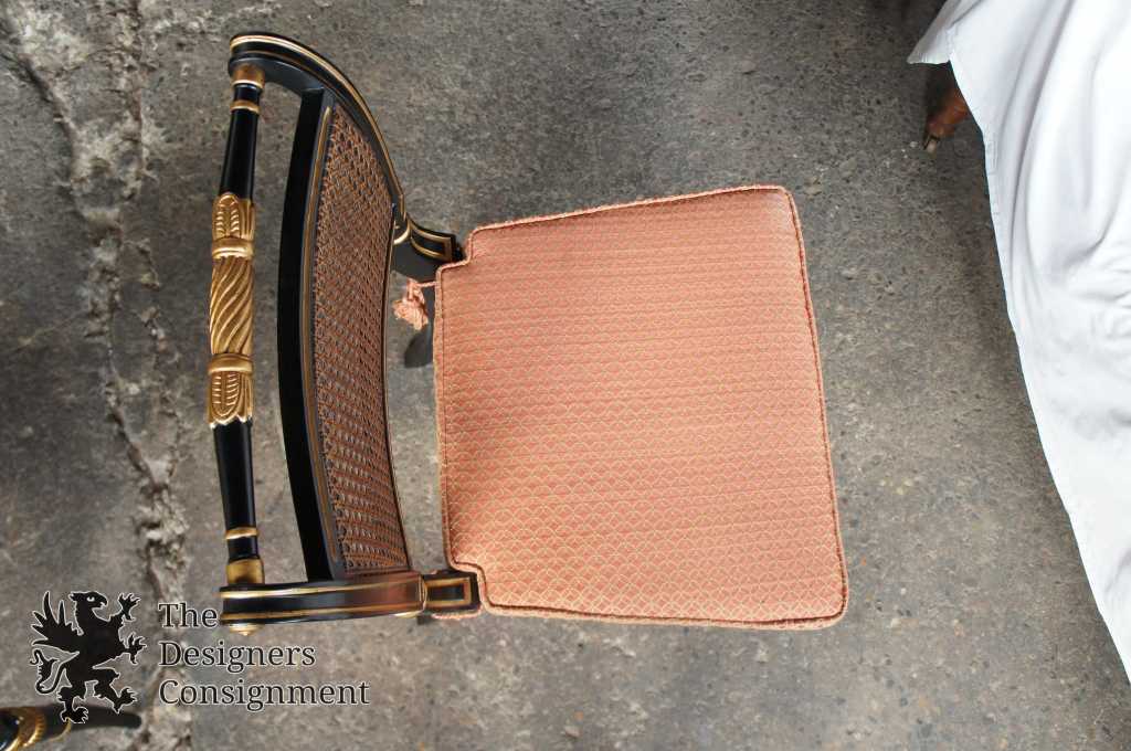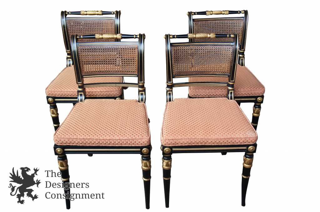 Striking and very difficult to find set of 4 Regency style dining chairs from the Baker Furniture Stately Homes Collection. Black finish with gold accents, caned backs and seats. Each seat features a removable cushions with tassels along the rear.