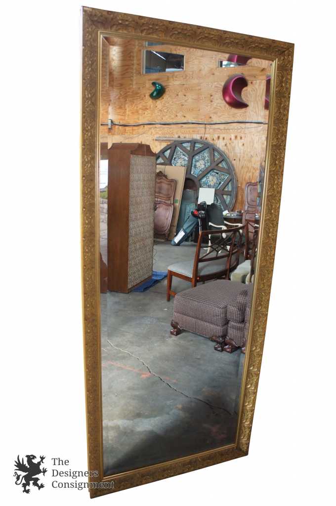 A Hollywood Regency style mirror that could be used along the floor or any wall. The mirror can be mounted vertically, or horizontally. Frame is made from wood with a raised floral acanthus design along the front and gadrooned trim. The frame is gold with an antiqued red undertone. Mirror is beveled.
