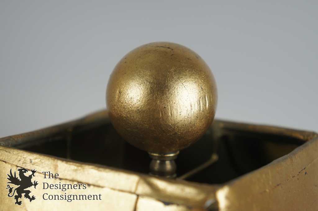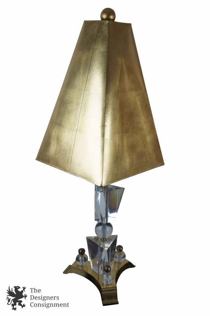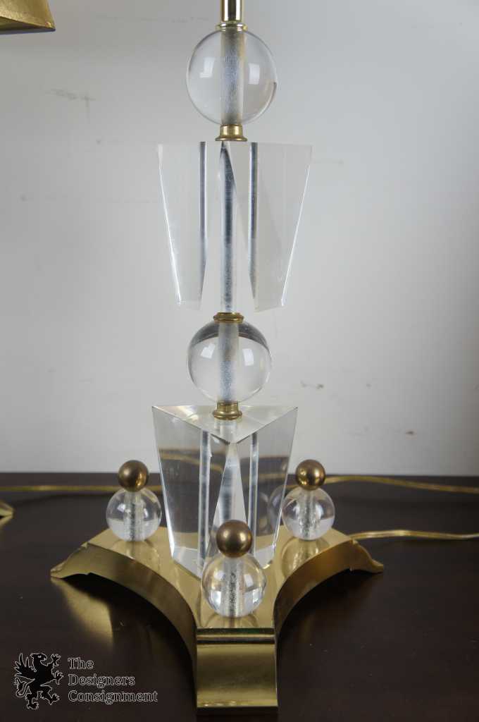 Lovely pair of art deco style table lamps. Features a geometric glass design over a brass tripod shaped base. Finished with a gold shade.