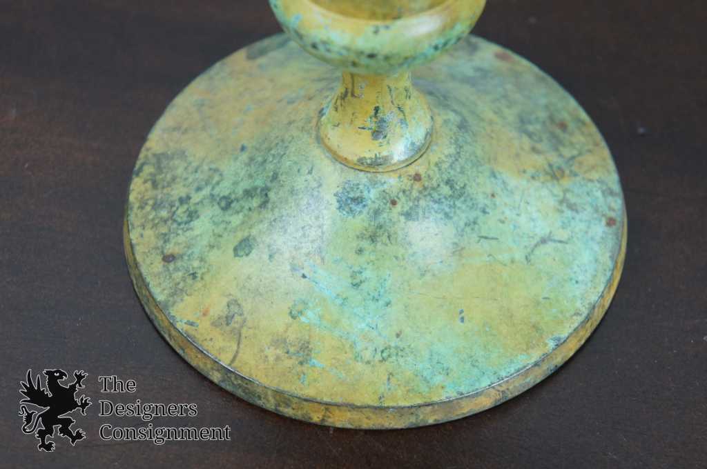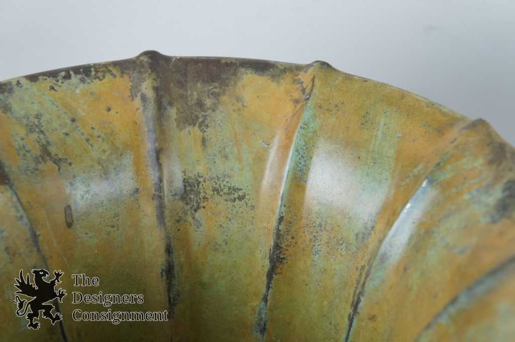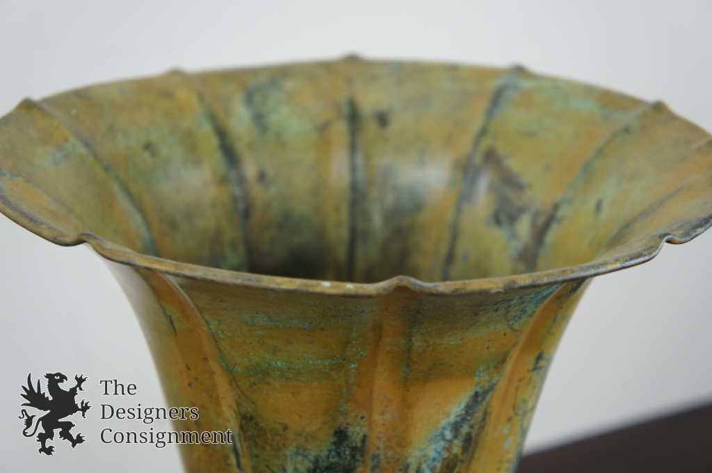 2 Art Deco Style Rustic Painted Metal Trumpet Vases Urn Fluted Green Patina 15