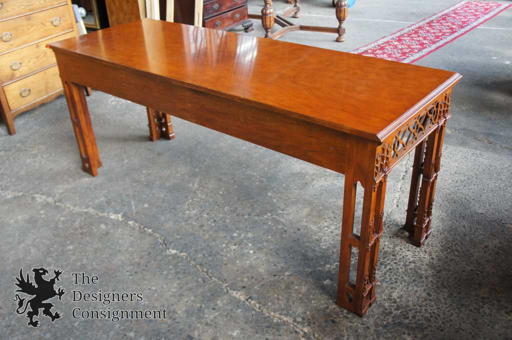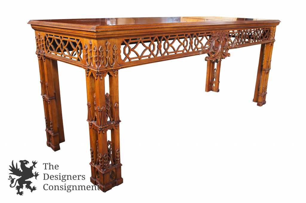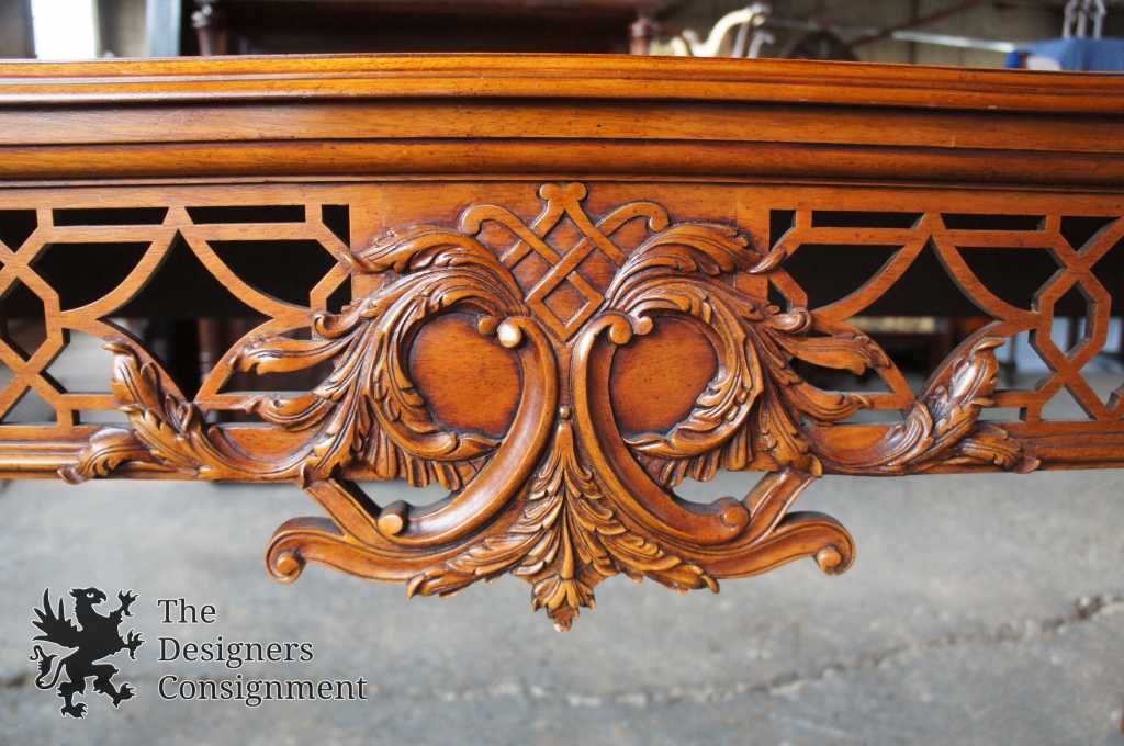 An unusual Irish Chippendale carved mahogany side table. Features a moulded border to the rectangular top carved with acanthus flourish and pierced geometric lattice work. The cornered legs are perforated along the center with a formalized leaf, terminating into moulded block stylized foot. Reproduced from an Irish table circa 1760 found in the stately Longleat House, home to Alexander Thynn 7th Marquees of Math.