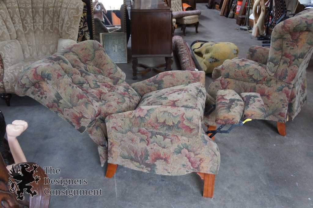 Pair of La-Z-Boy Classics Chippendale style reclining chairs. These plush chairs feature a floral upholstery and tufted back. Legs are finished in cherry. A comfy set for any sitting room.