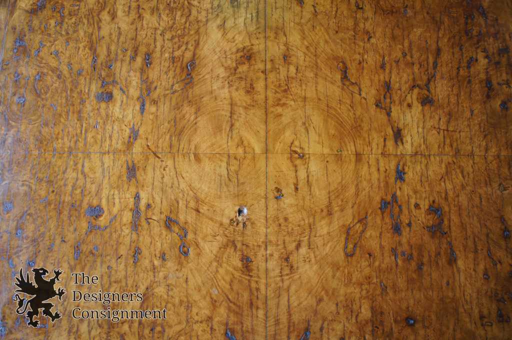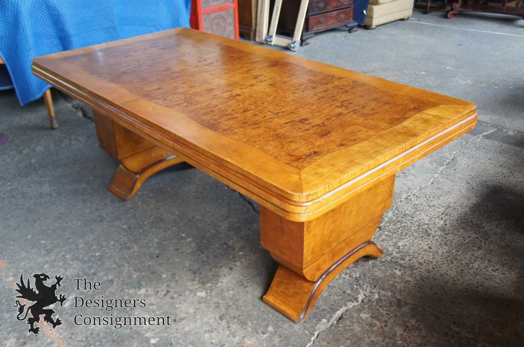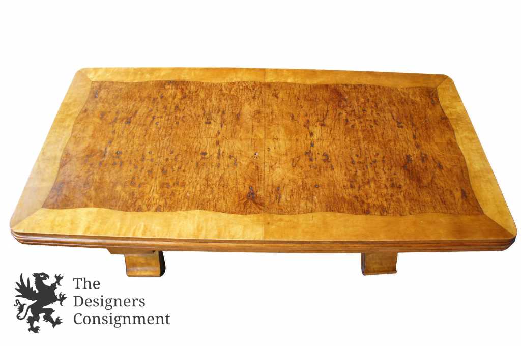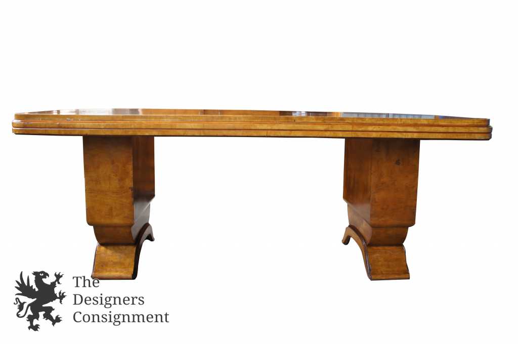 Early 20th Century Art Deco Dining Table. Burled walnut veneer with two-tone top. The top is one solid piece. This piece was used in an office as a desk. Matching sideboard and dry bar available separately. The dry bar which is pictured below is marked "M & CIA" along the back.