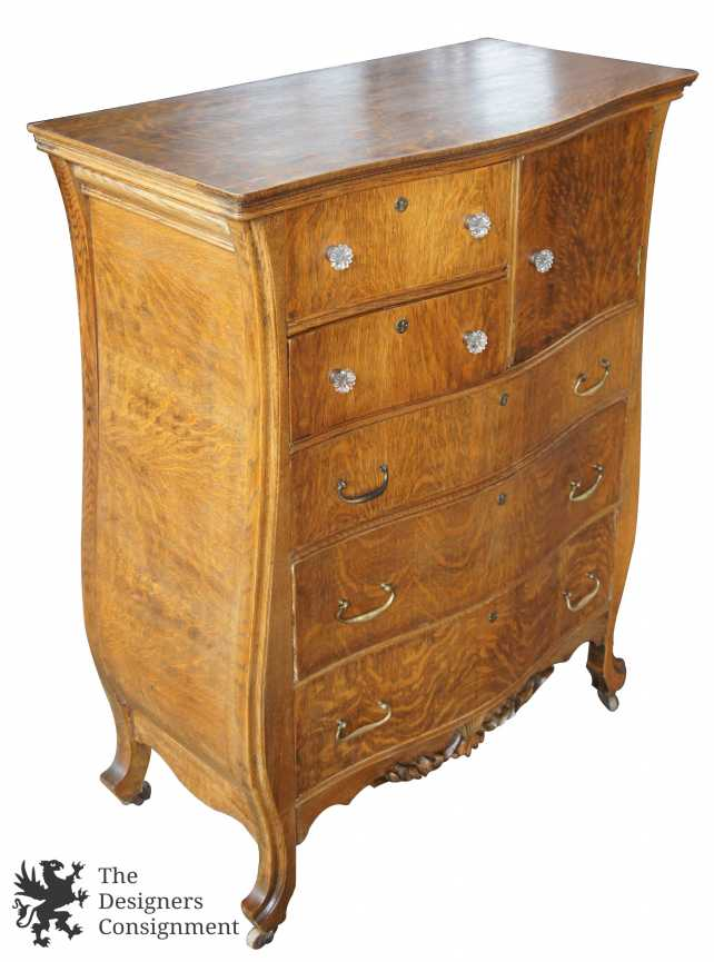 An early 20th century quartersawn oak chest. Serpentine front with carved accents. Features 6 drawers with glass/brass hardware and a compartment along the right for storage of larger items. Pad feet with original casters.