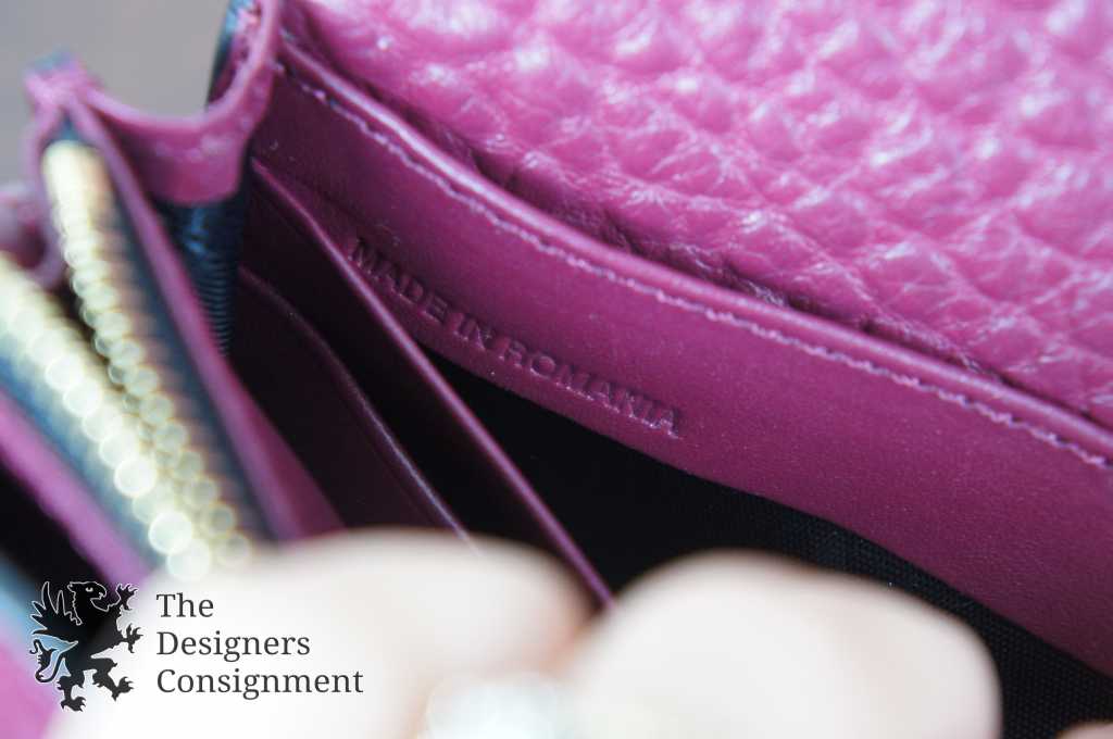 Interior has a central zip compartment opening to space for cell phone, (4) cards and money.
