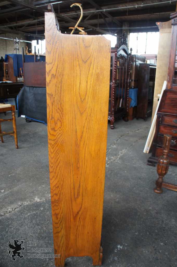 A beautifully designed petite oak bookcase. Made by J L Gillman, circa early 20th century. Features a glass front with handle and lock. Inside there is a lower pine cabinet door and fixed shelf. Peg holes are available along the side for additional shelving. The cabinet has a fixed upper back-splash with classic Victorian acanthus carving. On casters for ease of movement. This piece could be used for display, storage, or even as a gun cabinet if hardware was added.