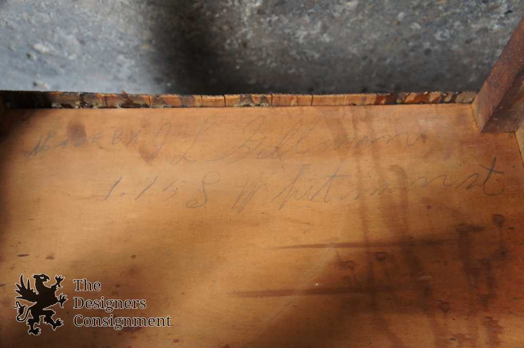 Good overall condition. Marking, distressing and staining from use. Lower door within cabinet originally hinged downward. Hinge marks can be seen at the very bottom.