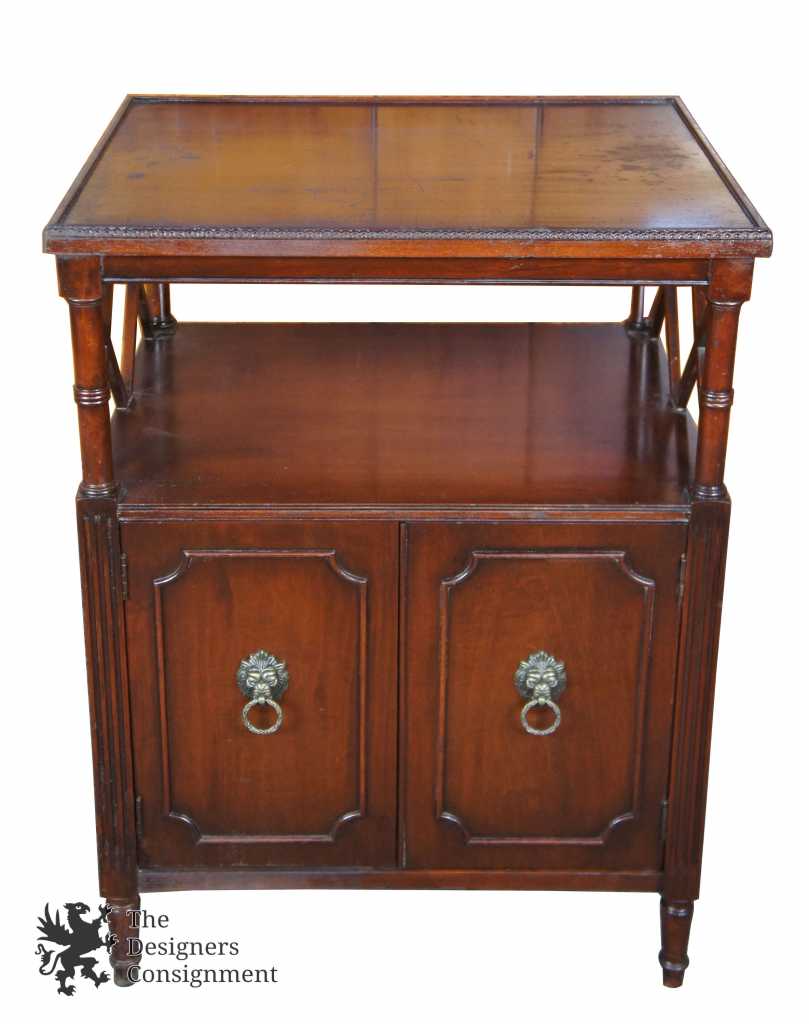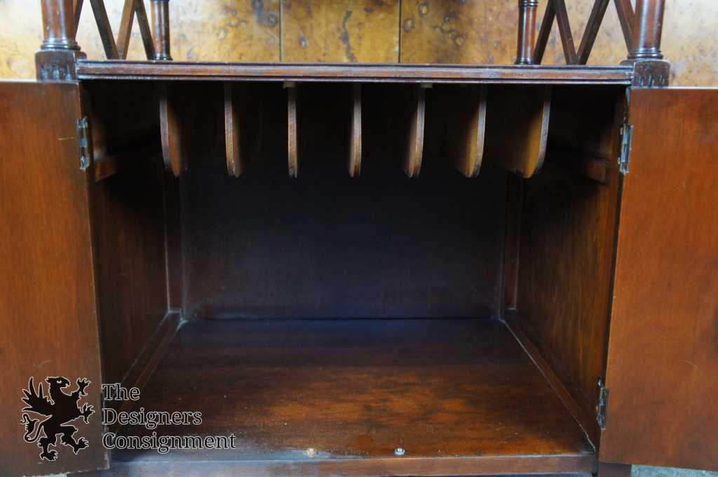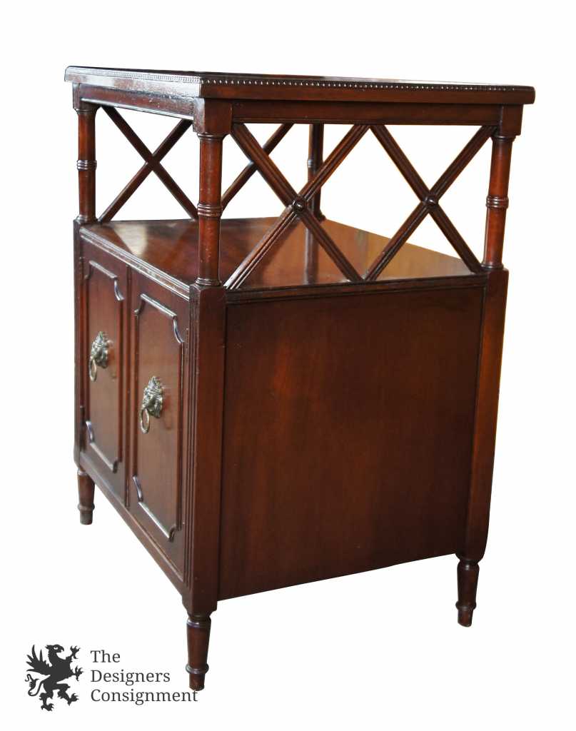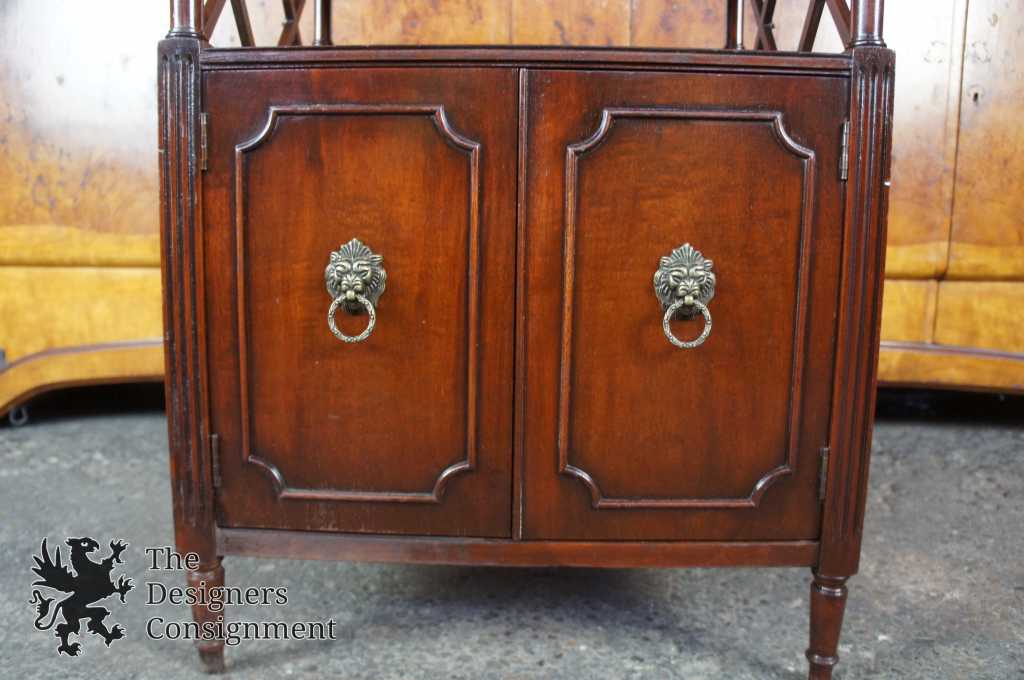 Circa 1940s Mahogany Record Cabinet. A beautiful open design with lattice side paneling between faux bamboo supports. Lower cabinet with lion head knockers opens to 8 sections for organizing records. A fun addition to any space.