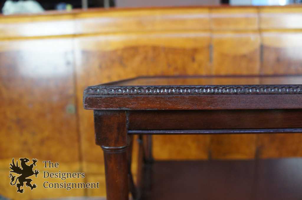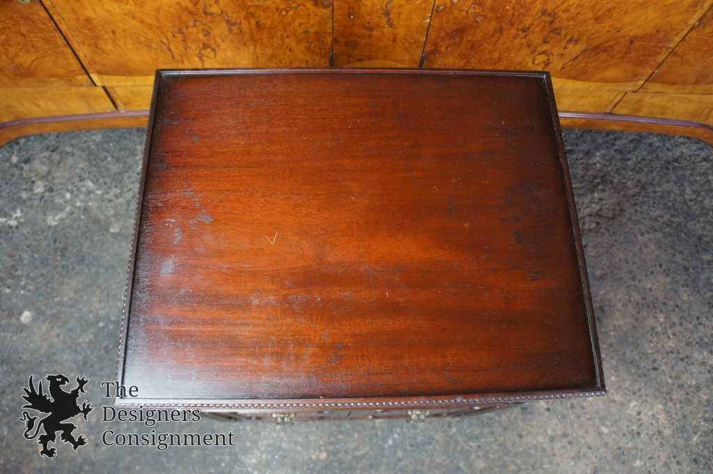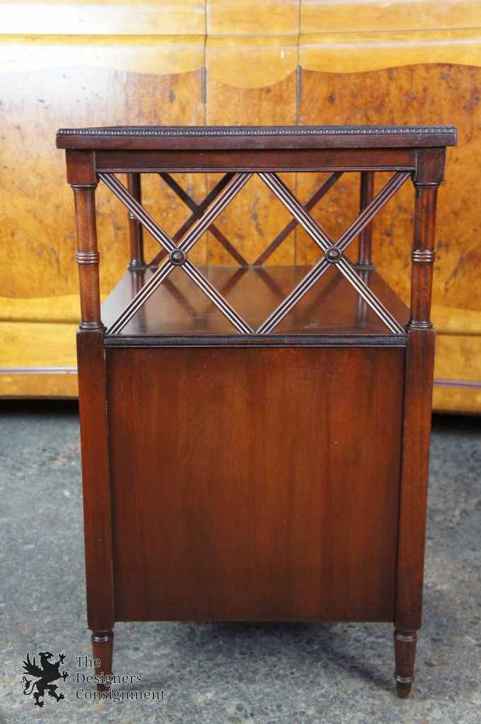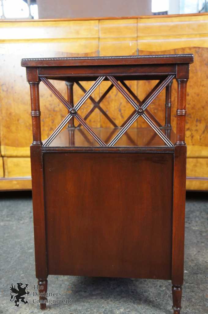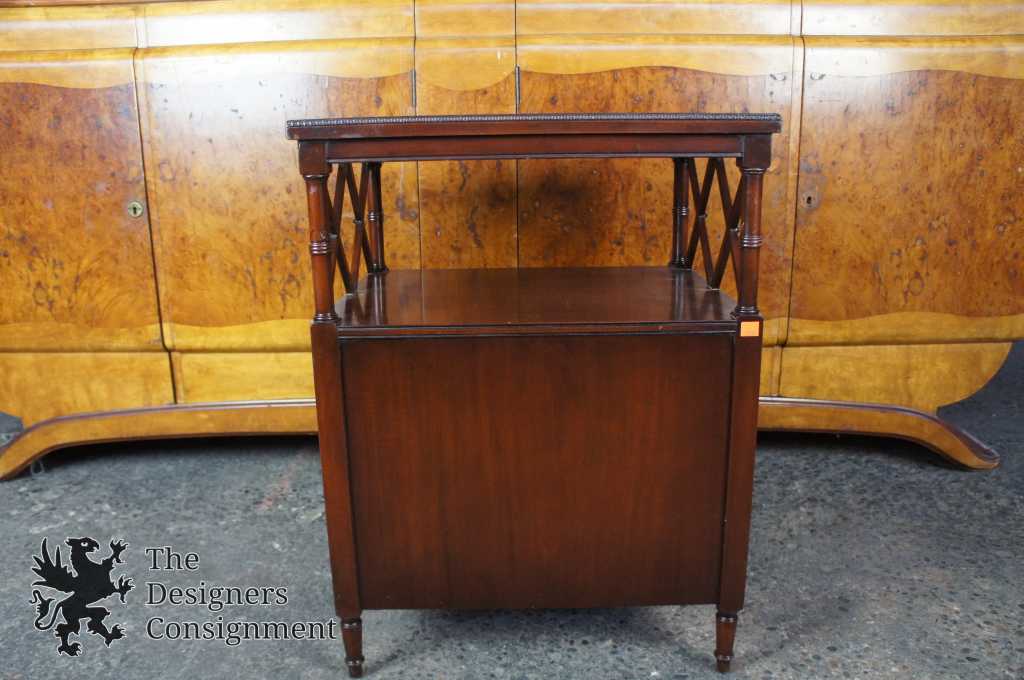 Circa 1940s Mahogany Record Cabinet. A beautiful open design with lattice side paneling between faux bamboo supports. Lower cabinet with lion head knockers opens to 8 sections for organizing records. A fun addition to any space.