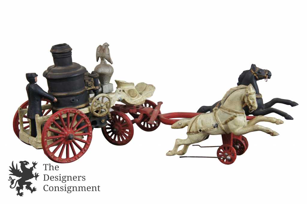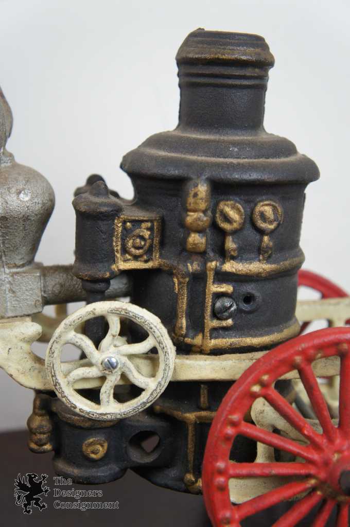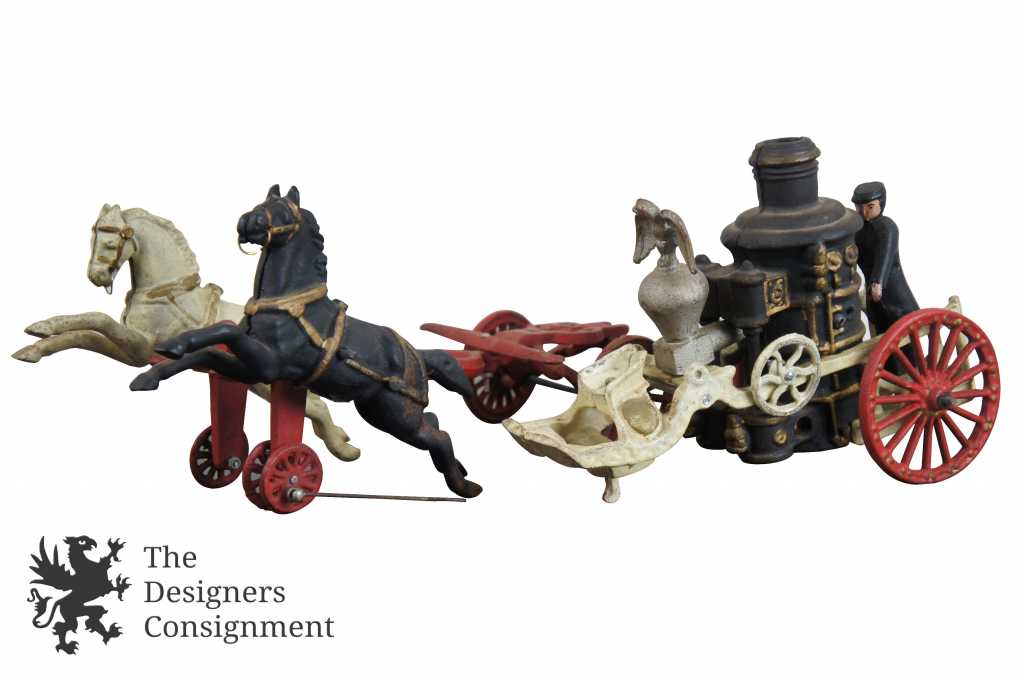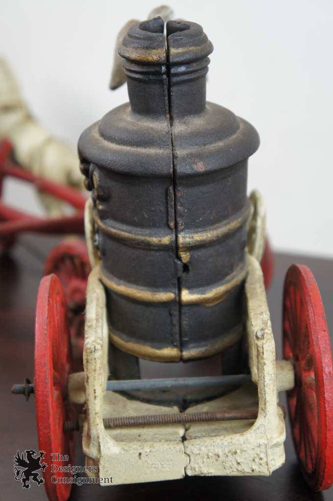 Reproduction cast iron fire engine steam pump and horses. A neat display piece for any setting.