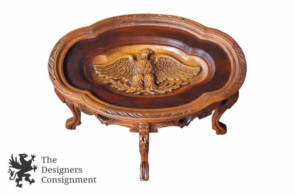 Up for consideration is a beautiful 2-tone walnut carved tray table. Features a scalloped top, pierced apron and 4 carbiole carved legs leading to paw feet. At the very center is a high relief carved American Eagle set into the table surface. A neat addition to any setting
