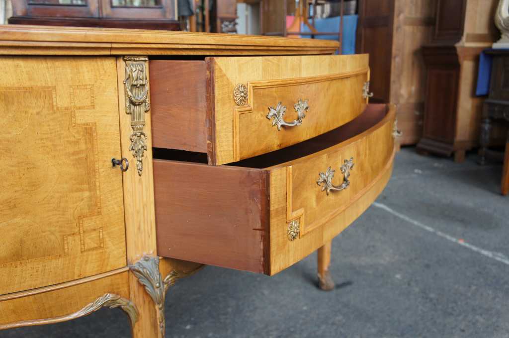 An exquisite French walnut sideboard by Robert Irwin Furniture Company. Elegantly designed with matchbook veneered top and front surfaces. Includes bronze mounts, inlays, and acanthus carvings in addition to locking outer cabinets. Circa 1950.