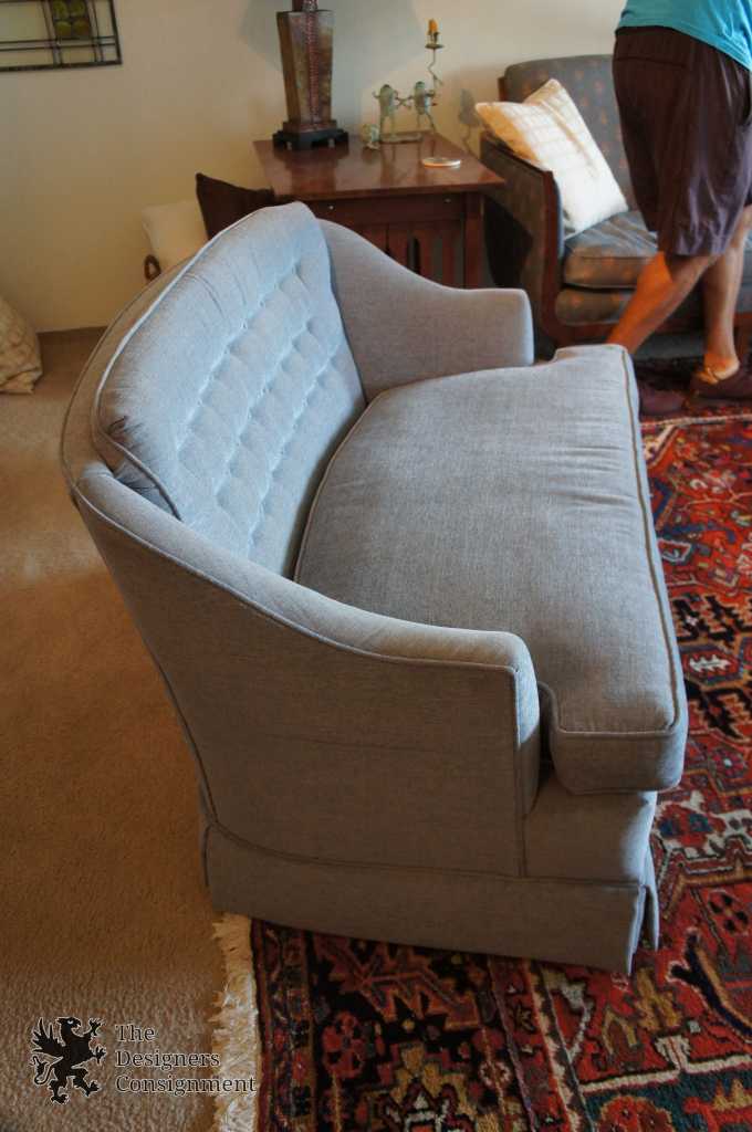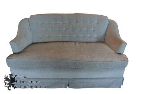 Begley Upholstery has been a staple of Columbus, Ohio since 1968. This traditional love-seat is estimated to be 20-30 years old. Upholstered in Gray with tufted back.