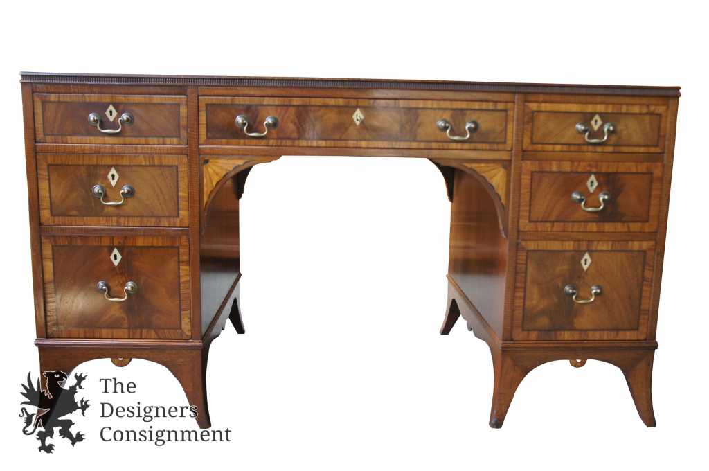 Up for consideration is a Sheraton Revival desk made from Crotch Walnut. Elegantly designed with seven lockable drawers. Framed in Marquetry with inlaid keyholes and brass drawer pulls. A neat addition to any space.