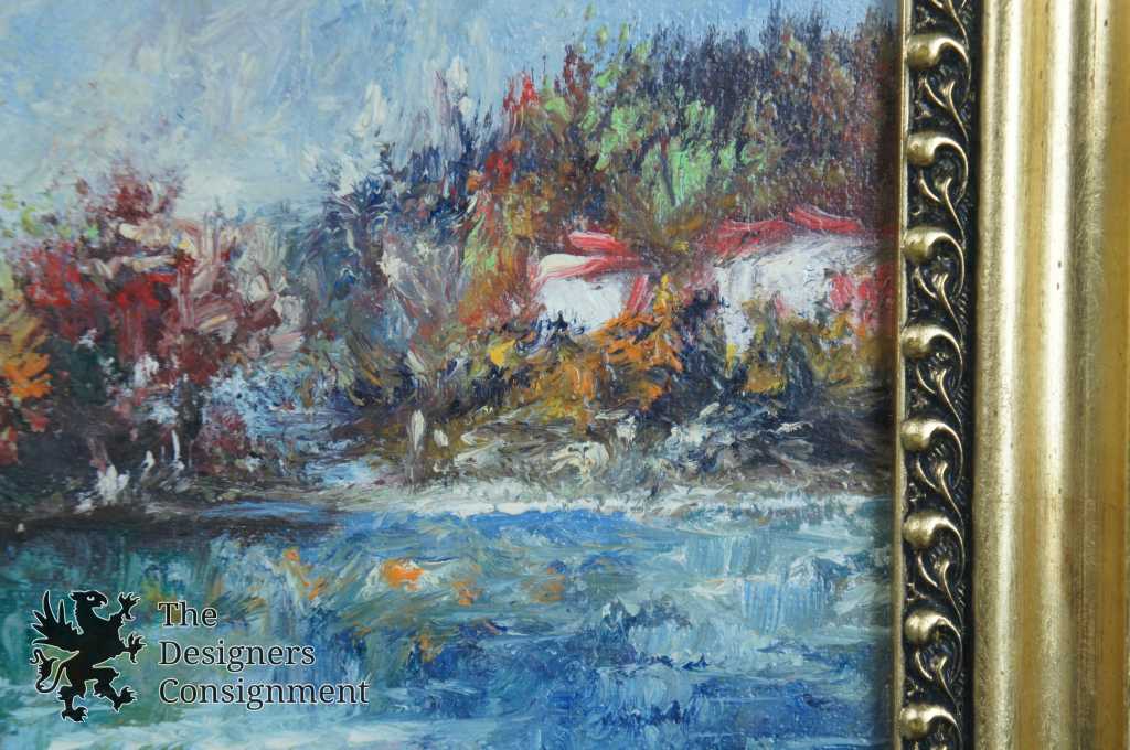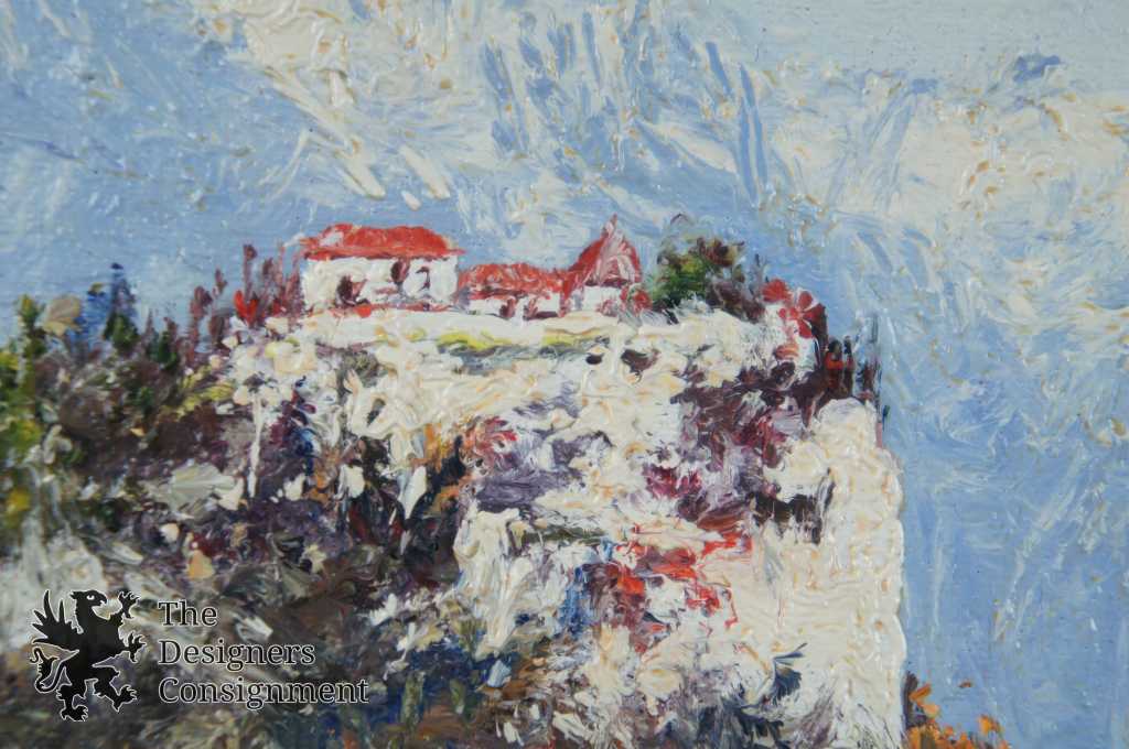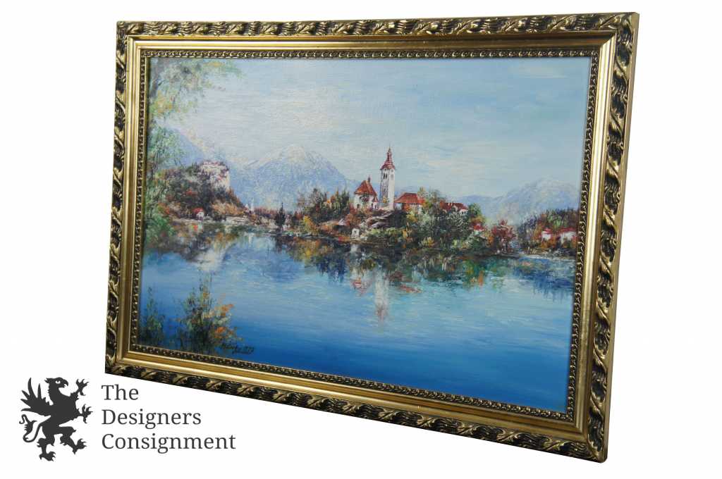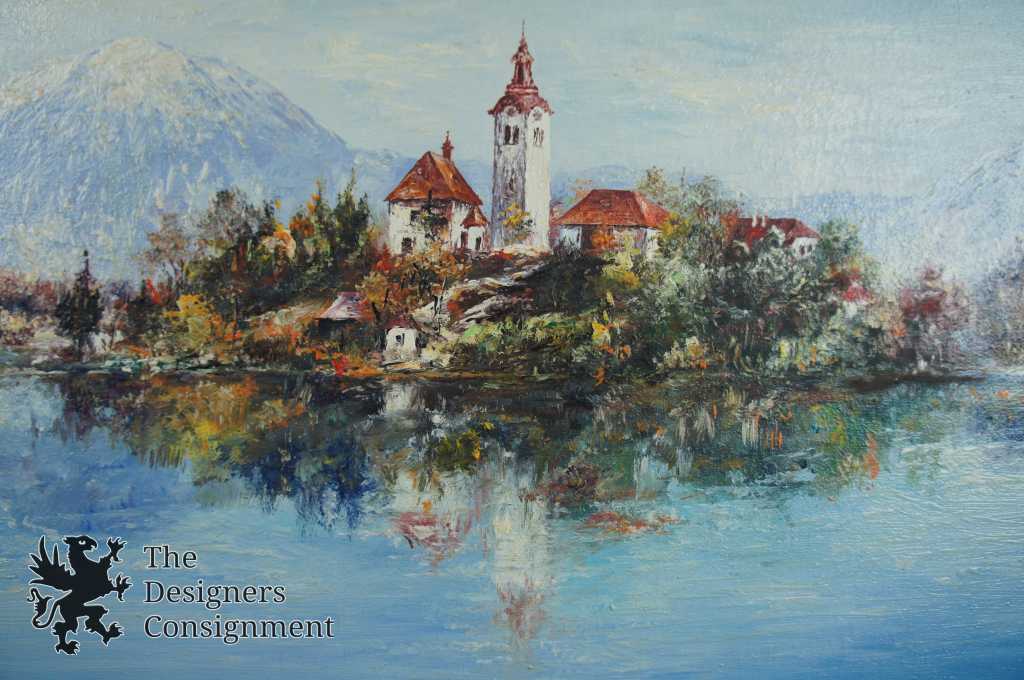 A lovely European European landscape focusing on a chateau within a mountainous region. Vivid in color as the landscape reflects off of the water. Snow caps seen in the background. A great piece for any home.