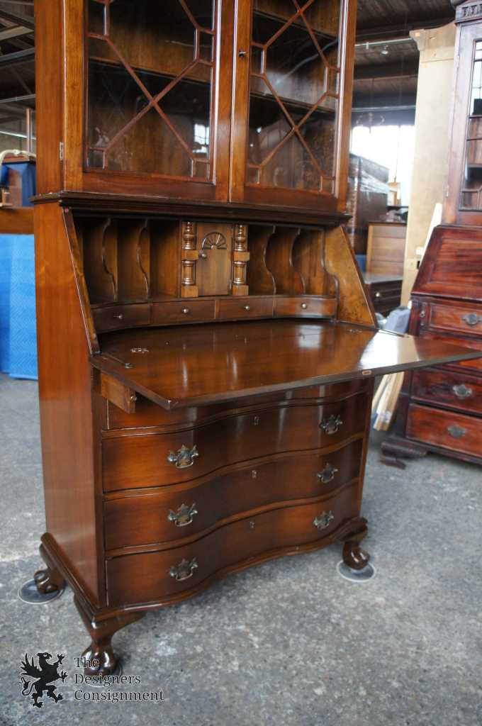 A gorgeous serpentine front 2 piece secretary desk. Made from walnut with ball & claw feet. Interior opens to cubbys and pigeon holes. Upper bookcase portion shows an open pediment with turned finial. Doors are glass with fretwork. There are 2 interior bookcase shelves. Hardware is made of brass in classic Chippendale fashion. Locks are functional.