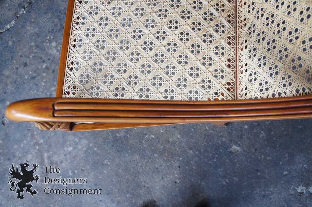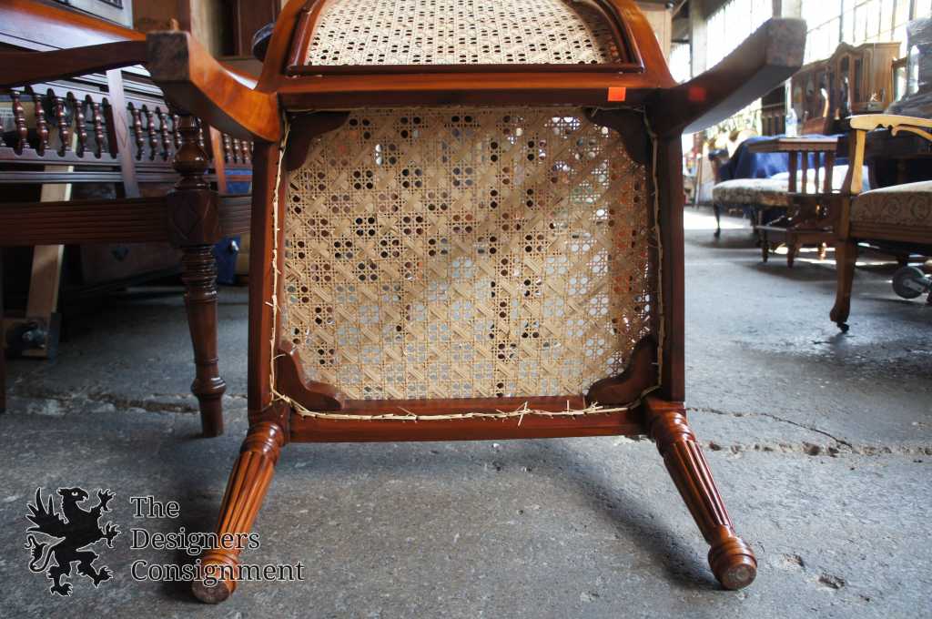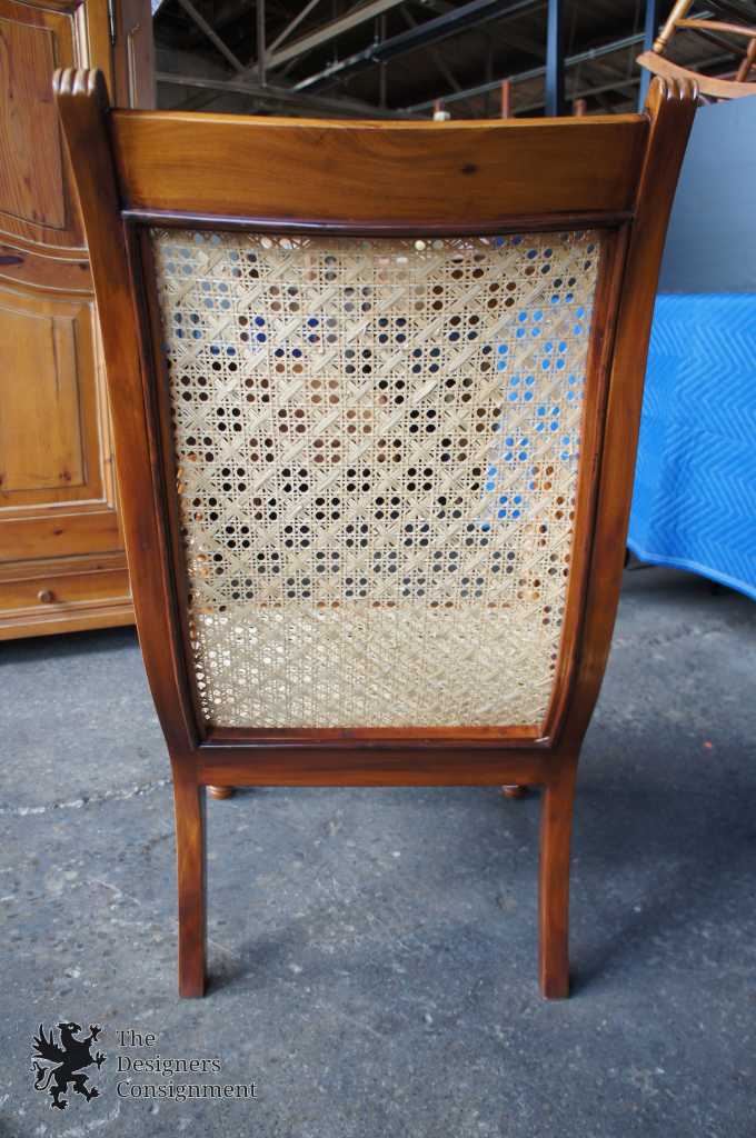 Anglo-Indian style caned armchair. Made from teak with a serpentine design carved with fluted accents.