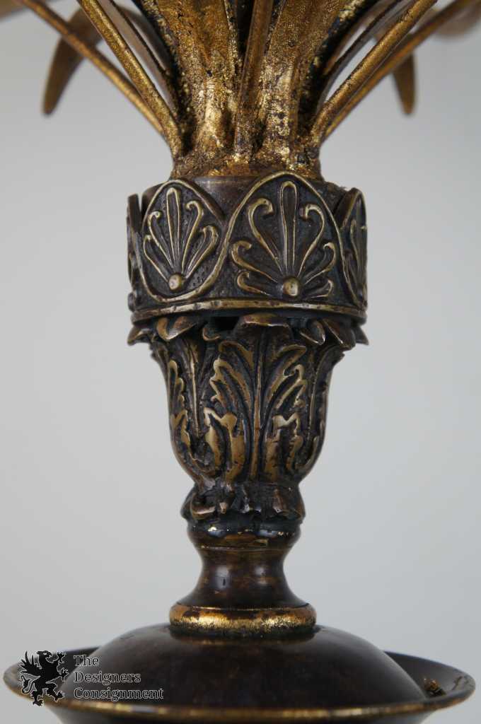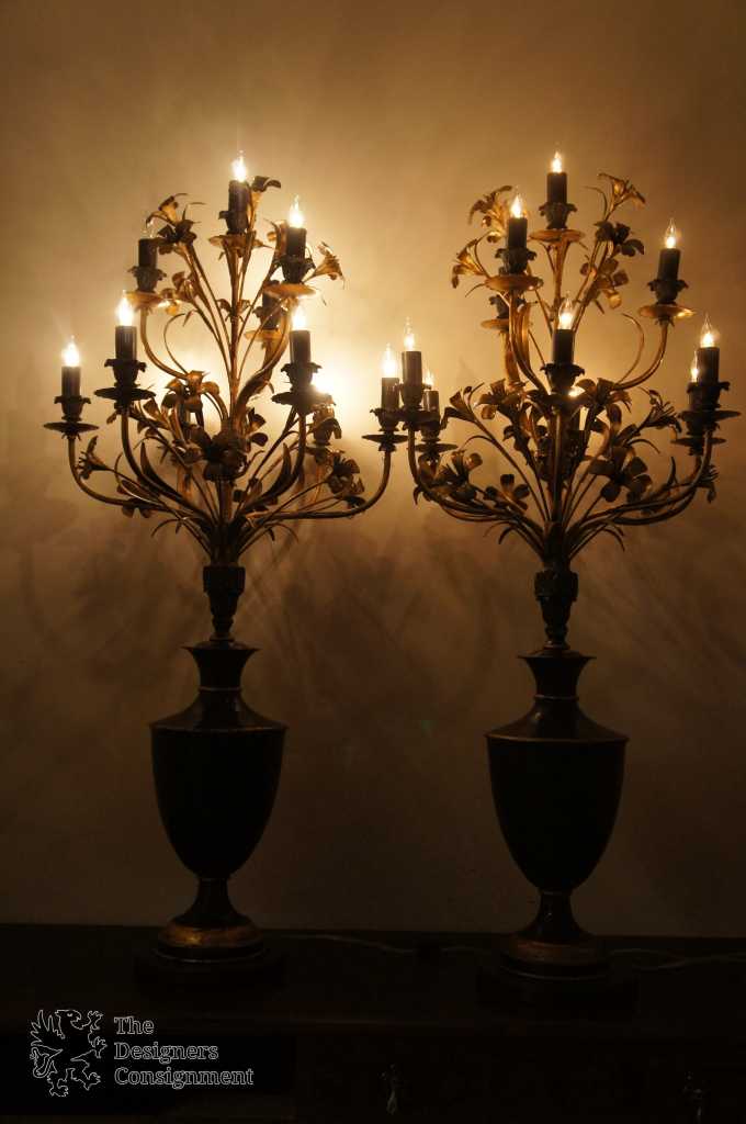 A gorgeous pair of monumental lamps that will make a statement on top of any sideboard or mantelpiece. Features a trophy shaped base with branch Florentine candelabra lamps along the top. Accommodates 10 lights. A neat addition to any setting.