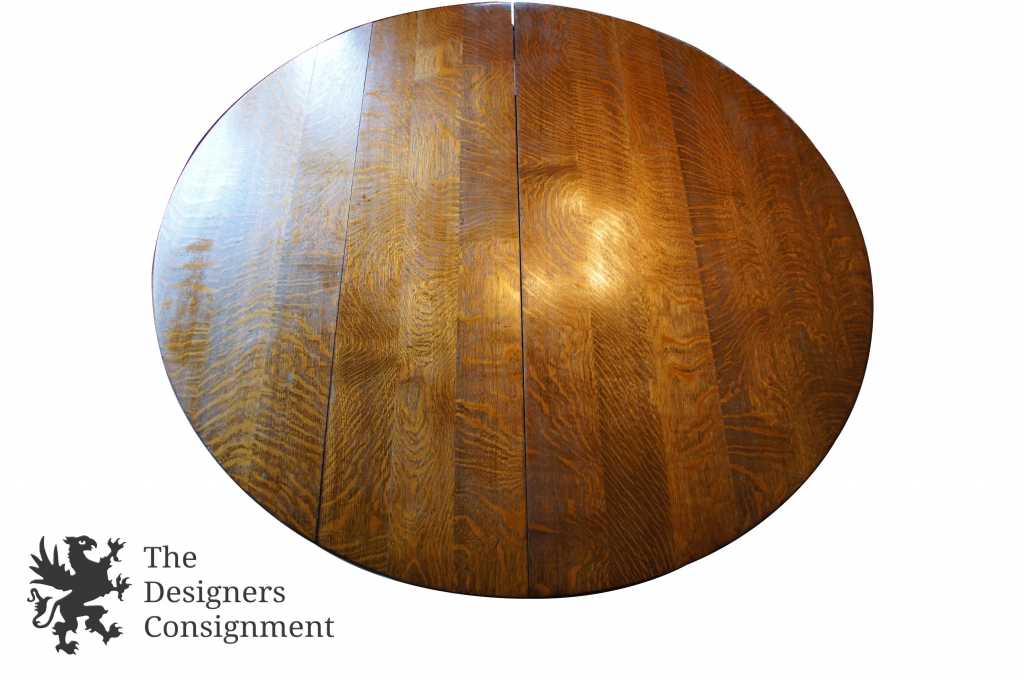 Quartersawn or "tiger" oak dining table with pedestal base and two leaves.