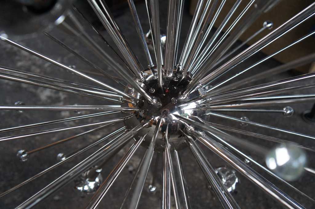 This modern take on the classic Sputnik chandelier, by New York designer Jonathan Adler, is perfect for raising the glamour stakes in any interior. In striking polished nickel, Adler's design features custom laser cut crown cups that cocoon the bulbs creating a chic modern glow. Tiny spokes with crystal accents further reflect the galactic light and extend out in a starburst fashion. Launch your interior into orbit!