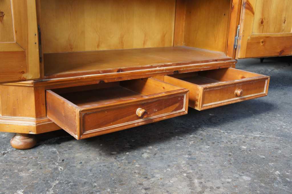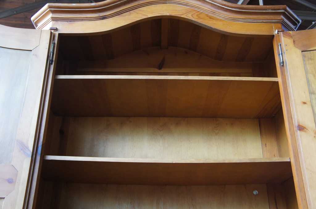 An exquisite armoire from Garcia Furniture Designs of California. Made from a distressed pine with white wash trim. Includes 3 adjustable interior shelves, lower drawers and a key for locking. Garcia specializes in reproducing old world designs using solid woods. A family business building of of 3 generations of craftsmanship.