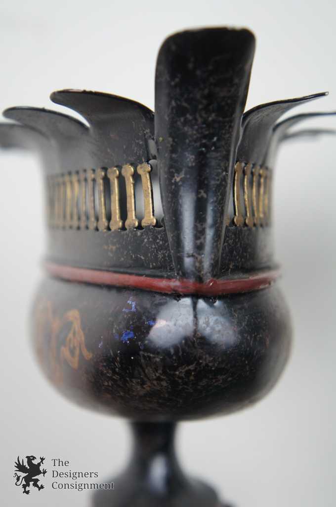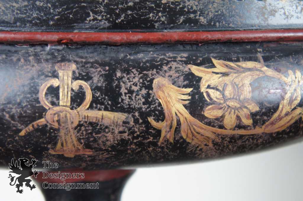 Beautiful pair of footed toleware Cachepots. Black with hand painted golden accents. A neat addition to any setting.