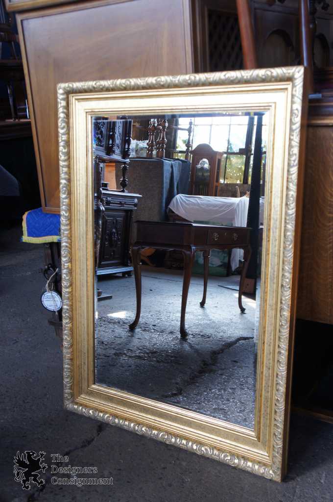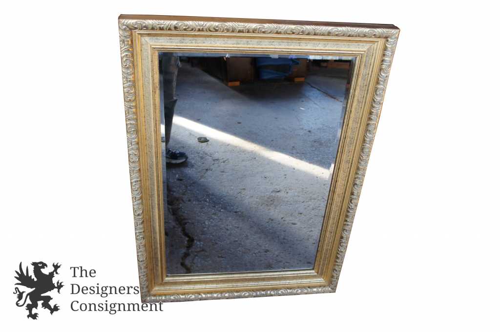 Hollywood Regency style wall hanging mirror. Features a carved frame with beveled glass.