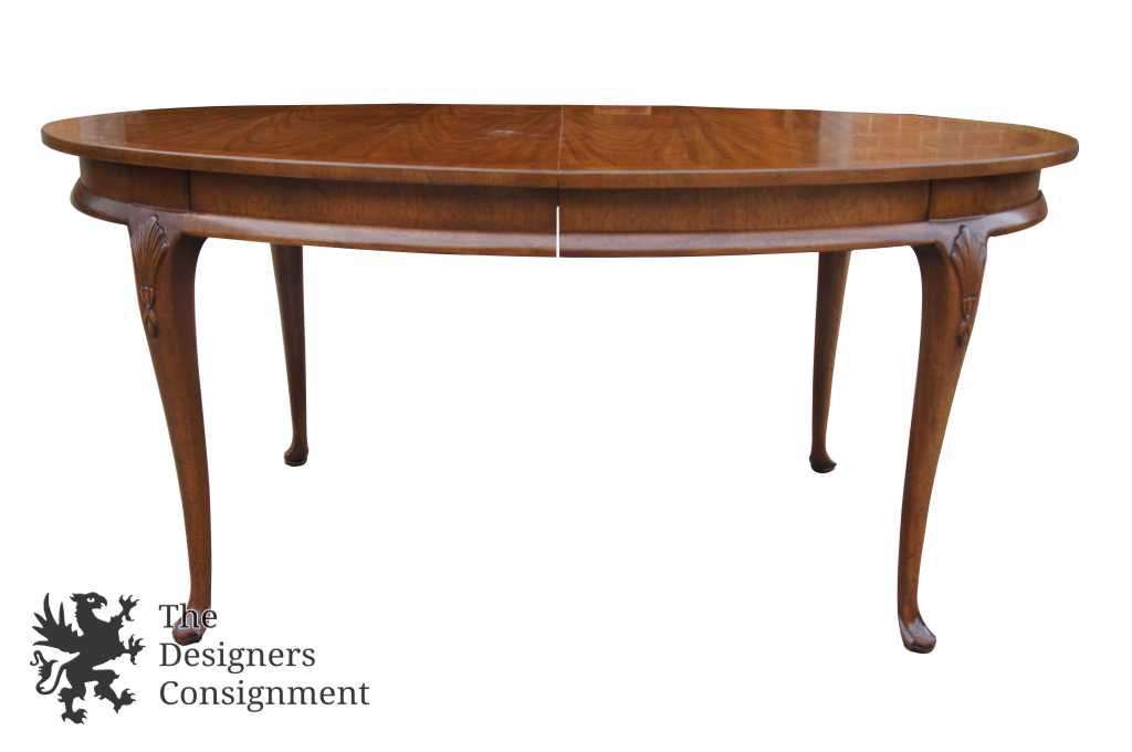 This beautiful Queen Anne dining table was designed by him during his time working for Mt. Airy Furniture in the 1960s. Made from a distressed walnut with a round extendable top and cabriole legs. Part of an entire dining room suite from an estate in Dayton, Ohio