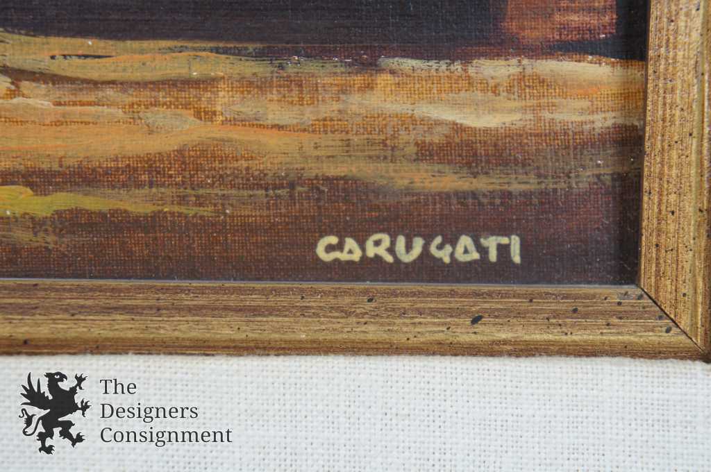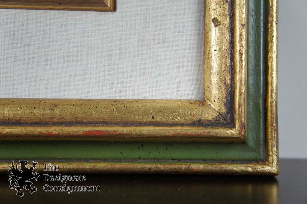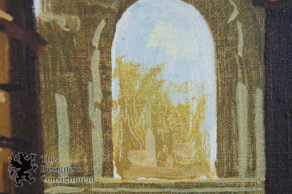 Angela was active in Italy. Born in Florence, and passed in Naples. She is known for Oil Painting and watercolors of ruins. This beautiful piece shows a doorway through ruins. Signed lower right with green frame trimmed in gold.