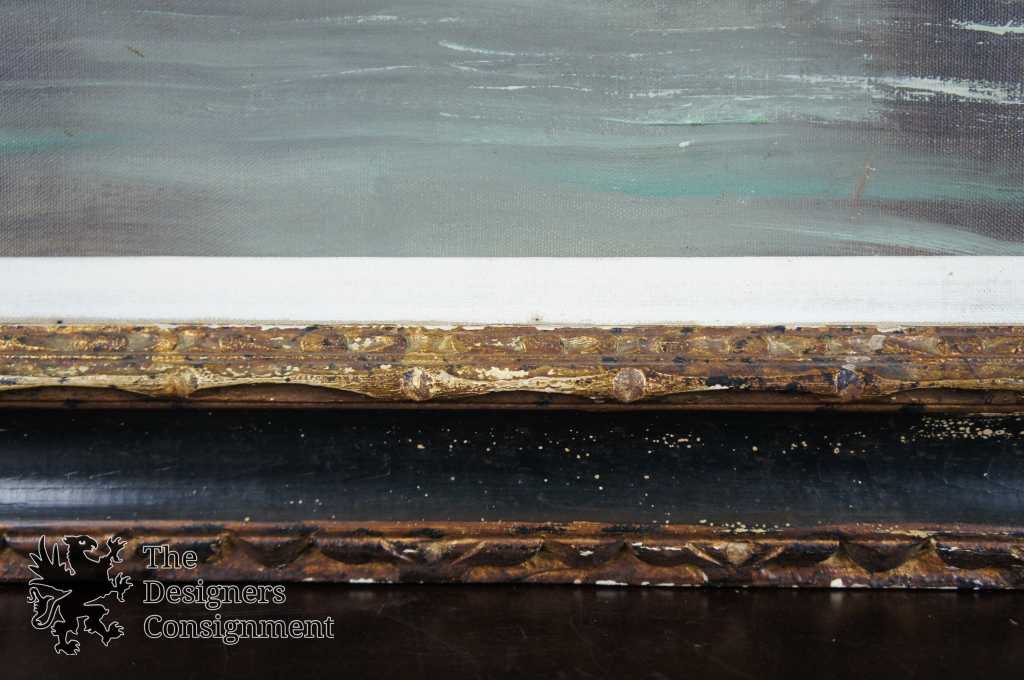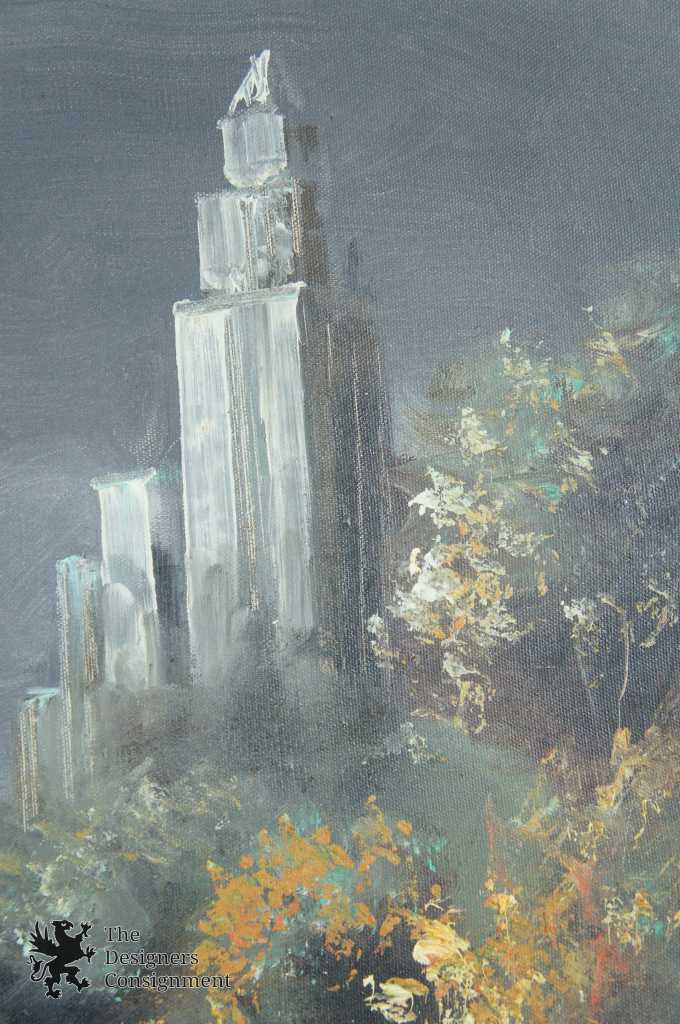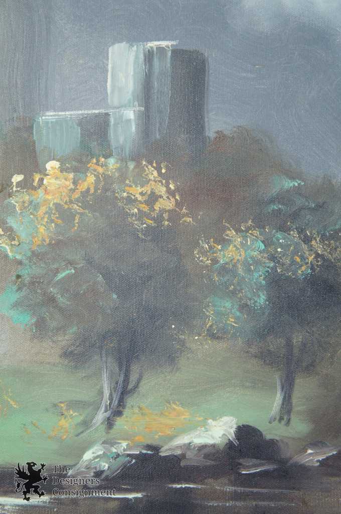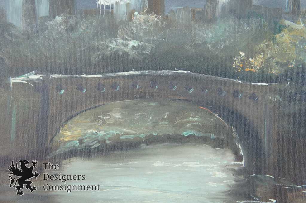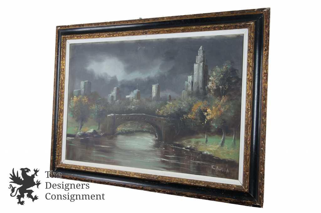 A beautiful landscape by Emilio Azarola. Shown in an evening setting by the water along tree-side with a bridge and buildings in the distance. Signed lower right and framed with a mat.