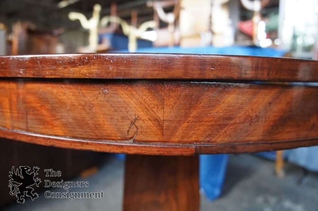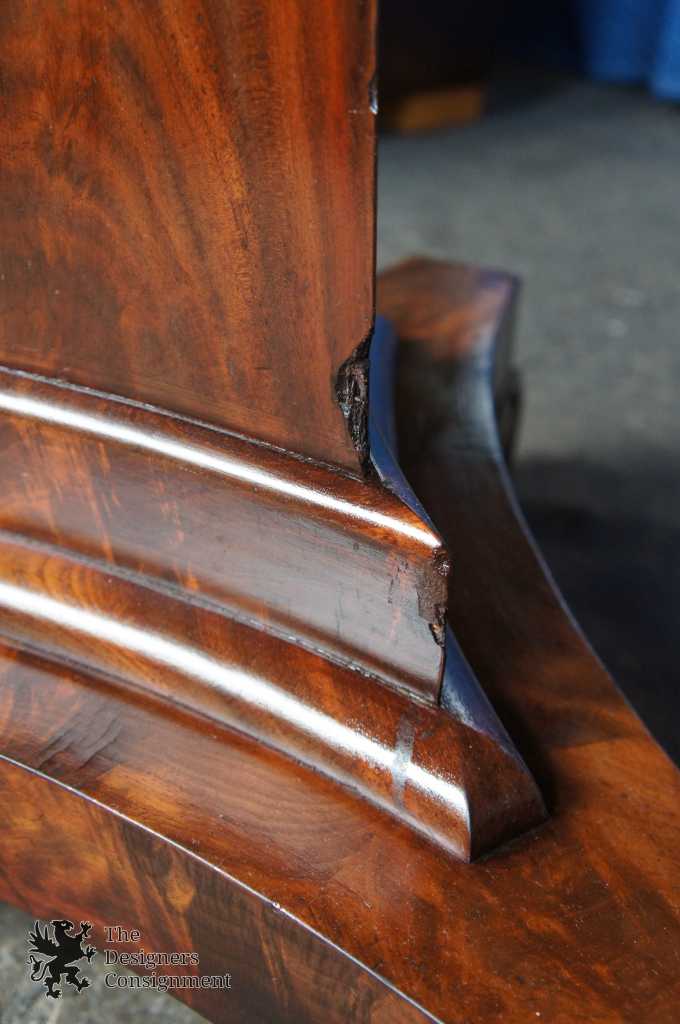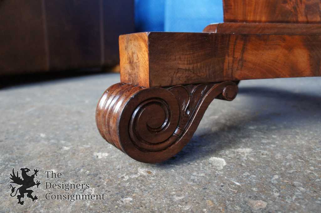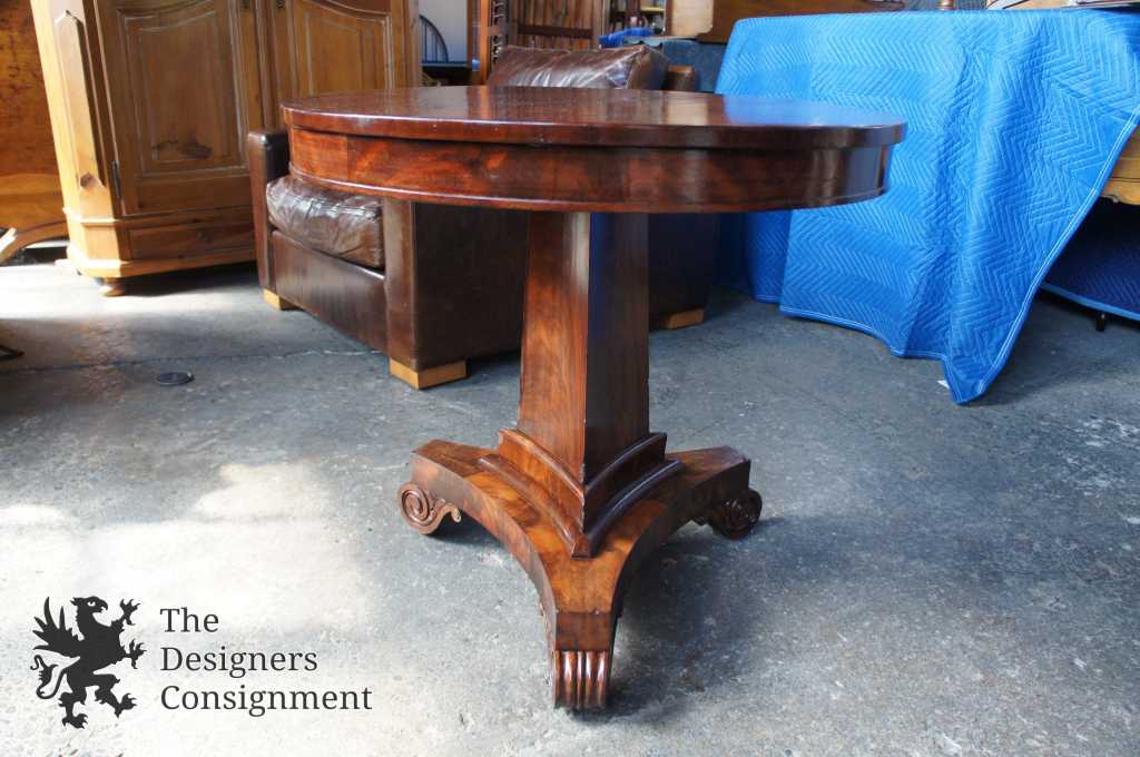 Up for consideration is a gorgeous American Empire Center table. Circa 1850-1870s. Made from Mahogany with a crouched veneer. The center has three sides with scrolled feet over casters. A beautiful addition to any setting.