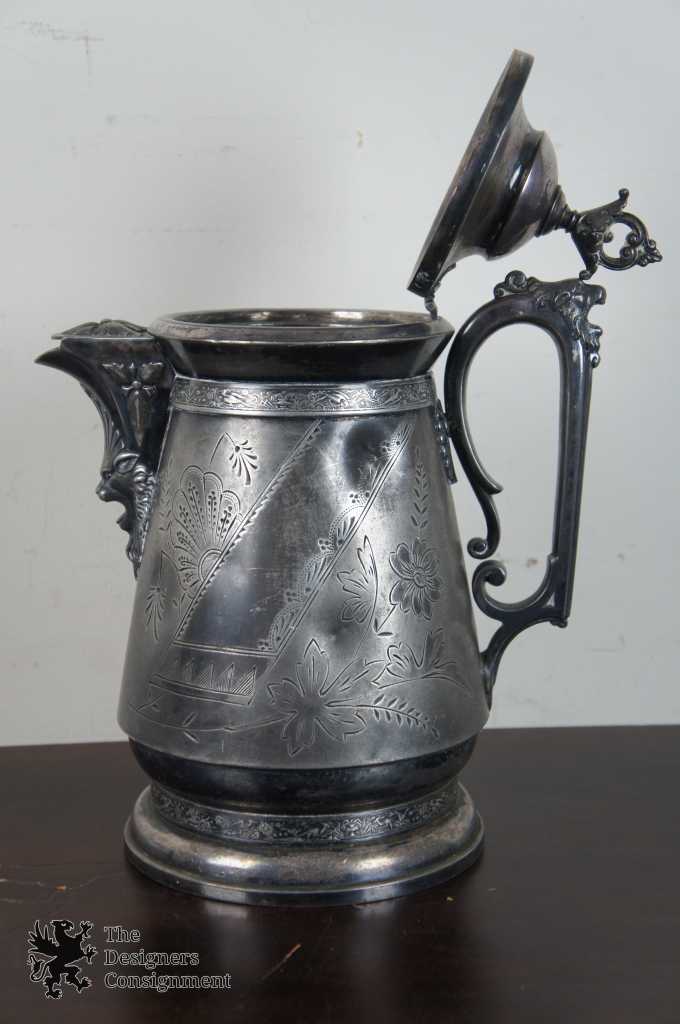 An exquisite Quadruple plated water jug from the Aesthetic Period. The aesthetic period was a late 19th century movement originating in England that promoted the appreciation of art, for art's sake. Its focused emphasized designs like the elaborate floral motifs and figural lion head accents on this jug made by Simpson Hall Miller & Co. A silver hollowware manufacturer in Wallingford Connecticut founded in 1866. Simpson Hall Miller & Co enjoyed a great success that led to their joining of the International Silver company before the turn of the century.