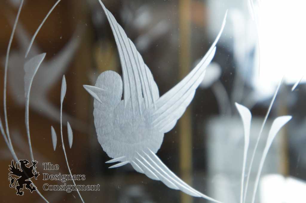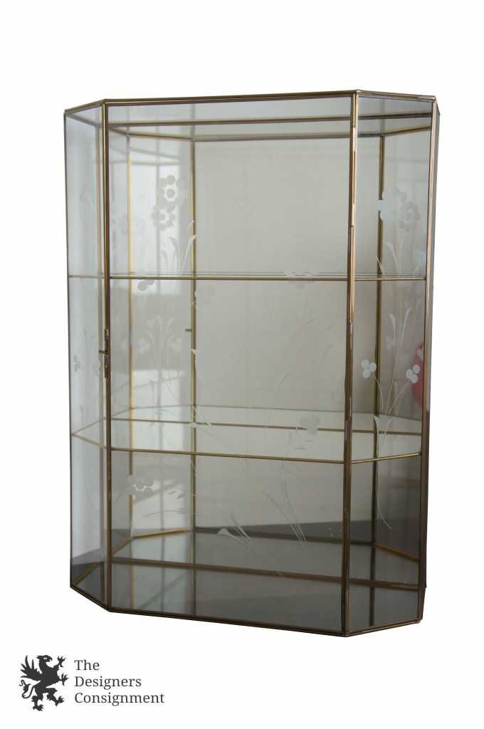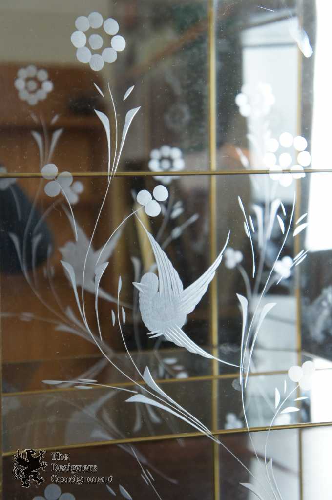 A beautiful 3 shelf brass framed curio cabinet. Perfect for hanging along the wall or placed on top of a table. Features a mirrored back and etched glass front with bird scene.
