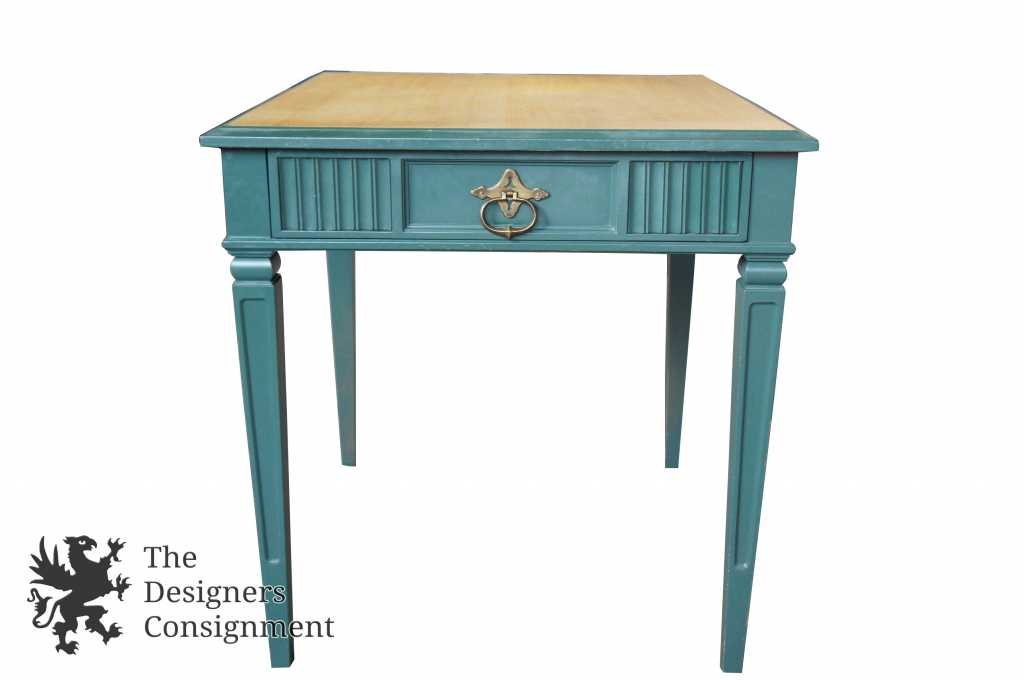 A neat vintage Drexel Heritage traditional accent table. Green with natural wood top. Includes a centrally located dovetailed drawer with chippendale style hardware and tapered legs. A great compliment to any setting.
