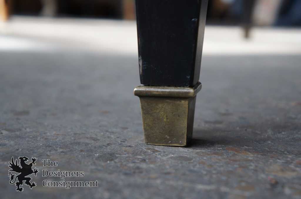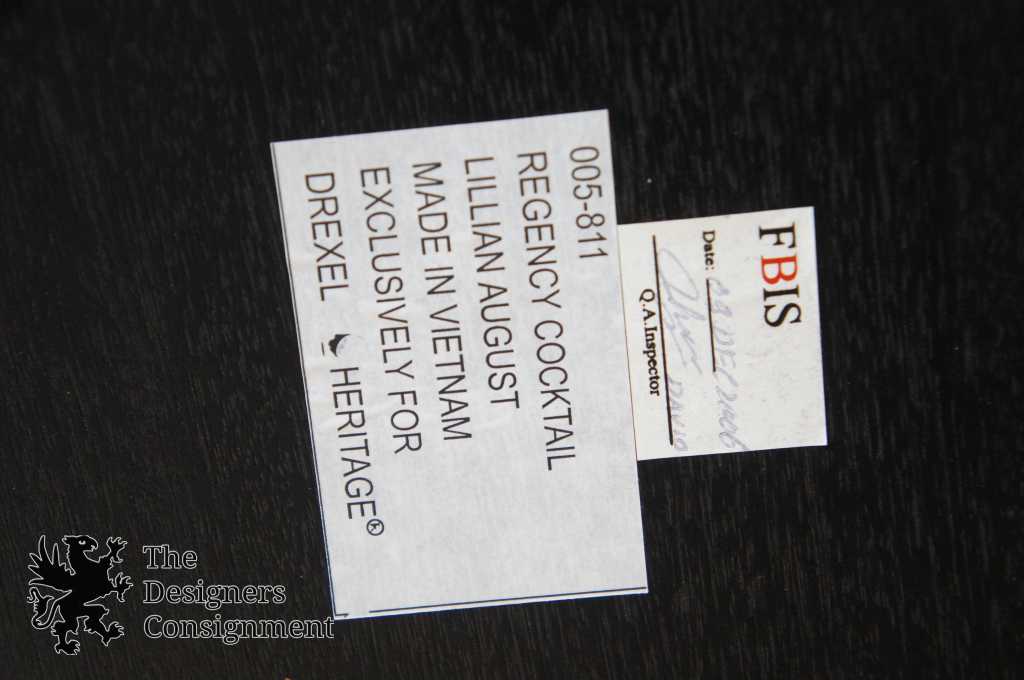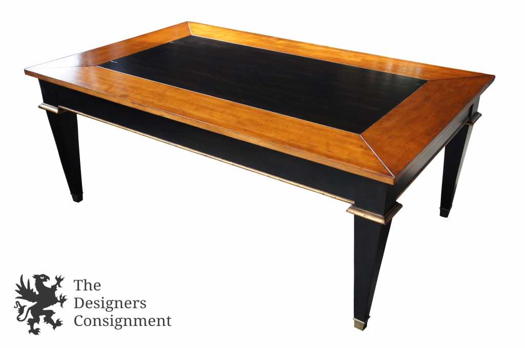 Lillian August for Drexel Heritage regency cocktail table. A simple yet elegant two tone design. Distressed natural maple and black with gold trim. The perfect compliment to any setting.