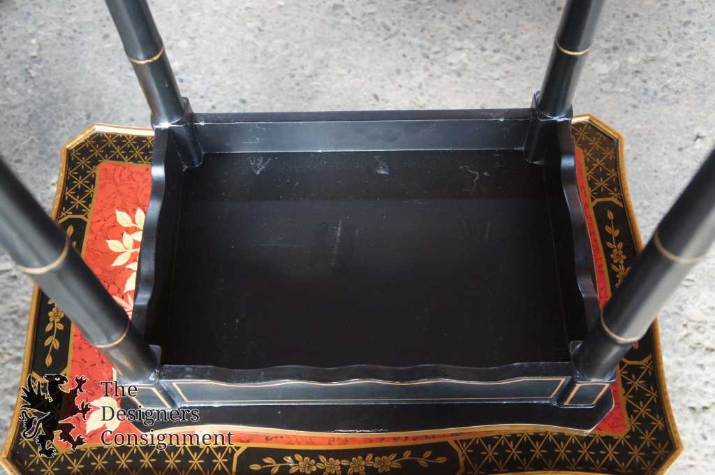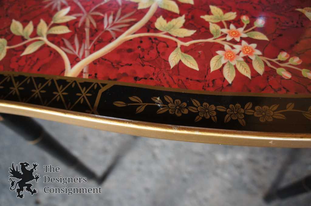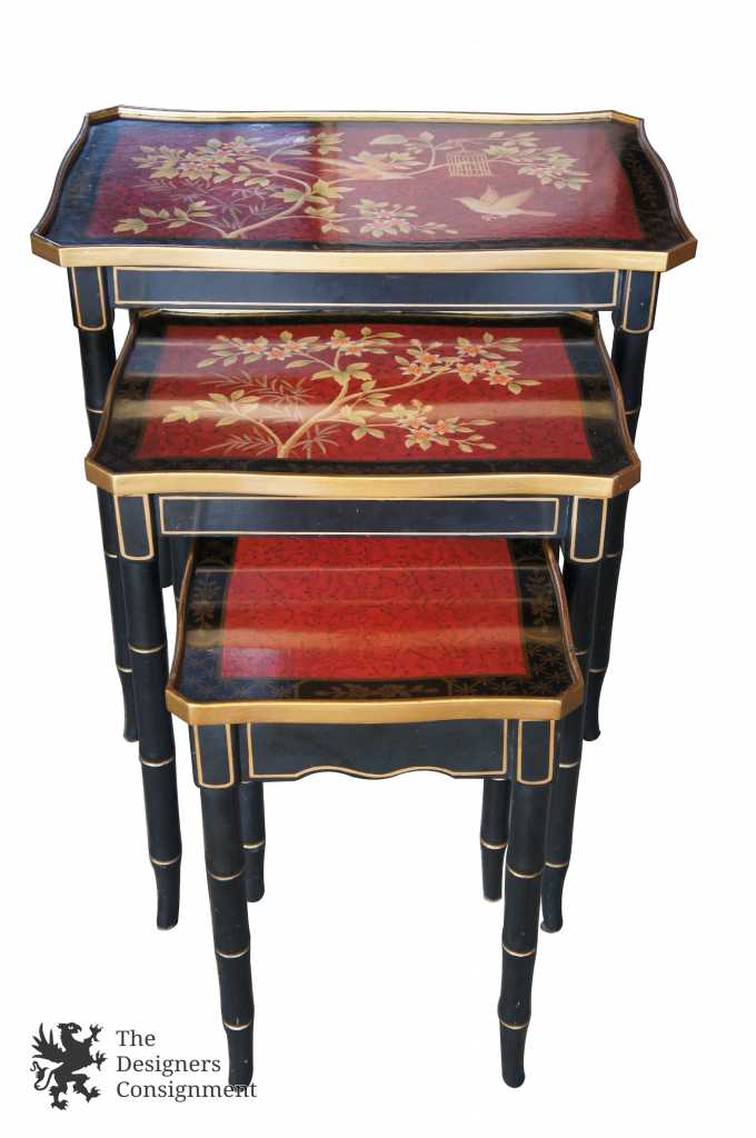 Exquisite set of 3 oriental nesting tables. Each table features black bamboo shaped legs that are trimmed in gold. The tops are also framed in black with a red center. The largest of the three shows birds perched withing the cherry blossom tree. The medium size just has the cherry blossom tree, and the smallest is red. Each of the red tops has a marbled design.