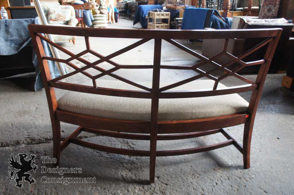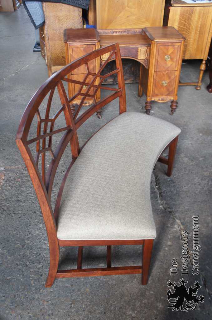 A beautiful curved bench seat by Universal Furniture. Perfect for dining or occasional use. Features a curved body with fretwork back and upholstered seat. Universal Furniture specializes in upholstery and has a showroom in North Carolina.